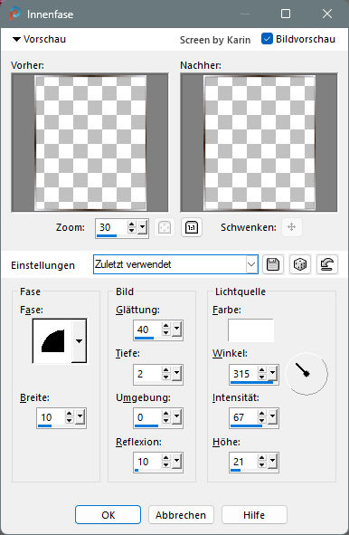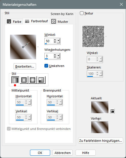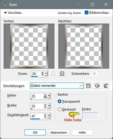![]() Rahmentutorial "Rozalie" Übersetzung mit PSP 2020, im Oktober 2025 ![]() Externe Filter: Alien Skin Eye Candy 5: Nature / Water Drops Graphics Plus / Cross Shadow Filters Unlimited / Toadies / What Are You Filters Unlimited / Filter Factory Gallery F / Instant Tile Vorbereitung: Ein schönes Bild Die Höhe des Bildes sollte 465 px betragen Wähle mit der Pipette zwei Farben aus deinem Bild In der Materialpalette Dunkel als Vordergrundfarbe, Hell als Hintergrundfarbe einstellen. Erstelle damit (z.B. bei "Vordergrund") folgenden Farbverlauf: Einstellungen siehe Screenshot ![]() ********************************************************************* Das Lineal kann als Orientierungshilfe mit der linken Maustaste mitgezogen werden. Schritt 1 Bild / Rand hinzufügen 2 px dunkle Farbe 3 px helle Farbe 2 px dunkle Farbe 7 px helle Farbe Diesen Rand mit dem Zauberstab markieren Und mit dem Farbverlauf (siehe Vorbereitung) befüllen Einstellen / Bildrauschen hinzufügen/entfernen - Bildrauschen hinzufügen Einstellungen siehe Screenshot ![]() Effekte / 3D-Effekte - Innenfase (Fase 2) Einstellungen siehe Screenshot ![]() Auswahl / Auswahl aufheben Bild / Rand hinzufügen 2 px dunkle Farbe 3 px helle Farbe 2 px dunkle Farbe Schritt 2 Bild / Rand hinzufügen 20 px helle Farbe Diesen Rand mit dem Zauberstab markieren Effekte / Plugins / Alien Skin Eye Candy 5: Nature - Water Drops Einstellungen siehe Screenshot ![]() Effekte / 3D-Effekte - Innenfase Mit den bereits eingestellten Werten von Schritt 1 Auswahl / Auswahl aufheben Bild / Rand hinzufügen 2 px dunkle Farbe 3 px helle Farbe 2 px dunkle Farbe Schritt 3 Bild / Rand hinzufügen 30 px helle Farbe Diesen Rand mit dem Zauberstab markieren Und mit dem Farbverlauf befüllen Effekte / Plugins / Filters Unlimited / Toadies - What Are You Einstellungen siehe Screenshot ![]() Effekte / 3D-Effekte - Taste Einstellungen siehe Screenshot Auswahl / Auswahl aufheben Schritt 4 Bild / Rand hinzufügen 2 px dunkle Farbe 3 px helle Farbe 2 px dunkle Farbe 7 px helle Farbe Diesen Rand mit dem Zauberstab markieren Und mit dem Farbverlauf befüllen Einstellen / Bildrauschen hinzufügen/entfernen - Bildrauschen hinzufügen Einstellungen wie bereits vorhanden, siehe Schritt 1 Effekte / 3D-Effekte - Innenfase Einstellungen wie bereits vorhanden Auswahl / Auswahl aufheben Bild / Rand hinzufügen 2 px dunkle Farbe 3 px helle Farbe 2 px dunkle Farbe Schritt 5 Bild / Rand hinzufügen 35 px helle Farbe Diesen Rand mit dem Zauberstab markieren Effekte / Plugins / Graphics Plus - Cross Shadow Einstellungen siehe Screenshot ![]() Effekte / Plugins / Filters Unlimited / Filter Factory Gallery F - Instant Tile Mit den Standardeinstellungen, siehe Screenshot ![]() Effekte / 3D-Effekte - Innenfase Mit den bereits eingestellten Werten Auswahl / Auswahl aufheben Setze noch dein Wasserzeichen, oder Copy auf das Bild Ebenen / Zusammenführen - Alle zusammenfassen Bild / Größe ändern Nach deinem Belieben (ich habe das Bild so belassen) Schärfe dein Bild eventuell nach Einstellen / Schärfe / Scharfzeichnen Nun ist die Arbeit geschafft, ich hoffe es hat ein bisschen Spaß gemacht. Danke an Dinie ![]() Weitere Beispiele: ![]() |