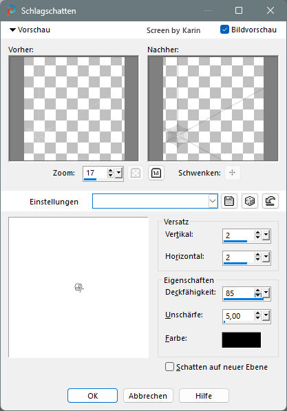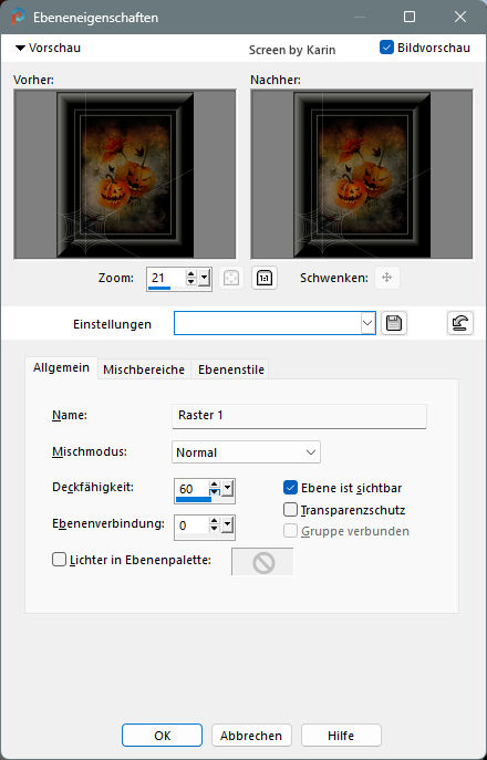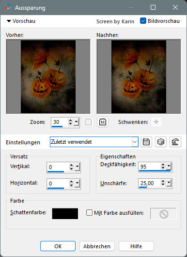 Rahmentutorial "Pumpkin" Das Urheberrecht für Foto und Tutorial liegt bei mir. Geschrieben mit PSP 2020, im Oktober 2025 ![]() (Foto wurde mit DeepDream bearbeitet) Benötigt wird: ein schönes Bild Mein Ausgangsbild hat die Größe 377 x 500 px. Im Download-Ordner befinden sich 2 Halloween Bilder die ich aus Fotos mit DeepDream generiert habe. Das helle Bild kann beliebig mit einem Hintergrund unterlegt werden. Zusätzlich noch ein Spinnennetz, mit freundlicher Genehmigung von Gabriele >https://gabjele.de/ ![]() Inhalt: ![]() Externer Filter: Filters Unlimited / Buttons & Frames / 3D Glass Frame 2 Vorbereitung: wähle eine hellere und eine sehr dunkle Farbe aus deinem Bild und stelle die beiden Farben in deiner Materialpalette ein, z.B. Hell als Vordergrundfarbe und Dunkel als Hintergrundfarbe Ich habe mich für diese Farben entschieden ![]() Das Lineal kann als Orientierungshilfe mit der linken Maustaste mitgezogen werden. Schritt 1 Aktiviere dein Originalbild Ebene / Neue Rasterebene Auswahl / Alle auswählen Effekte / 3D-Effekte - Aussparung Einstellungen siehe Screenshot ![]() Ebenen / Zusammenführen - Alle zusammenfassen Auswahl / Auswahl aufheben Schritt 2 Bild / Rand hinzufügen 2 px dunkle Farbe 1 px helle Farbe 2 px dunkle Farbe 1 px helle Farbe 20 px dunkle Farbe 1 px helle Farbe 2 px dunkle Farbe 1 px helle Farbe Schritt 3 Bild / Rand hinzufügen 70 px dunkle Farbe Diesen Rand mit dem Zauberstab markieren Effekte / Plugins / Filters Unlimited / Buttons & Frames - 3D Glass Frame 2 Einstellungen siehe Screenshot ![]() Auswahl / Auswahl aufheben Schritt 4 Bild / Rand hinzufügen 2 px dunkle Farbe 1 px helle Farbe 2 px dunkle Farbe Schritt 5 Wer möchte, kann nun das Spinnennetz aus dem Download wählen Bearbeiten / Kopieren Zurück zum Bastelbild Bearbeiten / Als neue Ebene einfügen Das Netz nun anordnen wie es dir gefällt Ich habe es gedreht ... Bild / Spiegeln - Vertikal spiegeln Und ich habe die Deckfähigkeit der Ebene herabgesetzt Ebenen / Eigenschaften Einstellung siehe Screenshot ![]() Das Spinnennetz habe ich soweit an die Kanten des Bildes geschoben, dass alle Endpunkte sozusagen im Rande außen verlaufen und nicht sichtbar sind. Jetzt noch etwas Schatten auf das Spinnennetz Effekte / 3D-Effekte - Schlagschatten Einstellungen siehe Screenshot ![]() Zum Schluß habe ich noch eine kleine Spinne in das Netz gesetzt :) Nun ist der Rahmen fertig. Setze noch dein Wasserzeichen, oder Copy auf dein Bild Ebenen / Zusammenführen - Alle zusammenfassen Ändere die Bildgröße nach deinem Belieben (Ich habe mein Bild nicht verkleinert) Evtl. Einstellen / Schärfe - Scharfzeichnen Ich hoffe, es hat ein bisschen Spaß gemacht. ![]() Weitere Beispiele: ![]() (Foto mit DeepDream bearbeitet) Dankeschön an die liebe Bea ![]() |