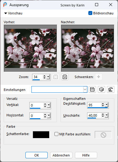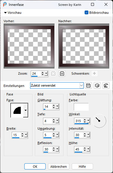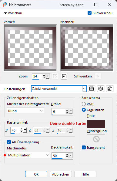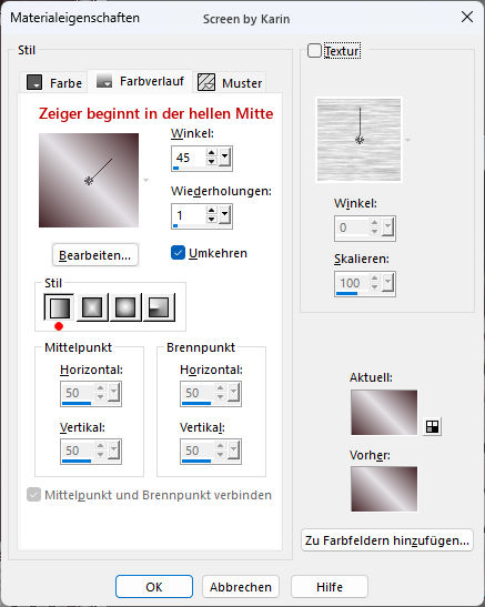 Rahmentutorial "Springtime" Das Urheberrecht für Foto und Tutorial liegt bei mir. Geschrieben mit PSP 2020, im März 2026 ![]() Benötigt wird: ein schönes Bild Mein Ausgangsbild hat die Größe 500 x 375 px. Externe Filter: Keine Vorbereitung: wähle eine helle und eine dunkle Farbe aus deinem Bild und stelle die beiden Farben in deiner Materialpalette ein, z.B. Hell als Vordergrundfarbe und Dunkel als Hintergrundfarbe Erstelle damit (bei "Vordergrund") folgenden Farbverlauf: Einstellungen siehe Screenshot ![]() Das Lineal kann als Orientierungshilfe mit der linken Maustaste mitgezogen werden. Schritt 1 Aktiviere dein Originalbild Ebene / Neue Rasterebene Auswahl / Alle auswählen Effekte / 3D-Effekte - Aussparung Einstellungen siehe Screenshot ![]() Ebenen / Zusammenführen - Alle zusammenfassen Auswahl / Auswahl aufheben Schritt 2 Bild / Rand hinzufügen 2 px dunkle Farbe 1 px helle Farbe 2 px dunkle Farbe 10 px helle Farbe Diesen Rand mit dem Zauberstab markieren Einstellen / Bildrauschen hinzufügen/entfernen - Bildrauschen hinzufügen Einstellungen siehe Screenshot ![]() Effekte / 3D-Effekte - Aussparung Die Unschärfe auf den Wert "10" ändern, siehe Screenshot ![]() Auswahl / Auswahl aufheben Bild / Rand hinzufügen 2 px dunkle Farbe 1 px helle Farbe 2 px dunkle Farbe Schritt 3 Bild / Rand hinzufügen 20 px helle Farbe Diesen Rand mit dem Zauberstab markieren Mit dem Farbverlauf (siehe Vorbereitung) befüllen Auswahl / Auswahl aufheben Schritt 4 Bild / Rand hinzufügen 2 px dunkle Farbe 1 px helle Farbe 2 px dunkle Farbe 10 px helle Farbe Diesen Rand mit dem Zauberstab markieren Einstellen / Bildrauschen hinzufügen/entfernen - Bildrauschen hinzufügen Einstellungen wie schon vorhanden, siehe Schritt 2 Effekte / 3D-Effekte - Aussparung Einstellungen wie schon vorhanden, siehe Schritt 2 Auswahl / Auswahl aufheben Bild / Rand hinzufügen 2 px dunkle Farbe 1 px helle Farbe 2 px dunkle Farbe Schritt 5 Bild / Rand hinzufügen 50 px helle Farbe Diesen Rand mit dem Zauberstab markieren Mit dem Farbverlauf befüllen Effekte / Kunsteffekte - Halbtonraster Einstellungen siehe Screenshot ![]() Effekte / Kanteneffekte - Stark nachzeichnen Effekte / 3D-Effekte - Innenfase (Fase 2) Einstellungen siehe Screenshot ![]() Auswahl / Auswahl aufheben Schritt 6 Bild / Rand hinzufügen 2 px dunkle Farbe 1 px helle Farbe 2 px dunkle Farbe 10 px helle Farbe Diesen Rand mit dem Zauberstab markieren Einstellen / Bildrauschen hinzufügen/entfernen - Bildrauschen hinzufügen Einstellungen wie schon vorhanden, siehe Schritt 2 Effekte / 3D-Effekte - Aussparung Einstellungen wie schon vorhanden, siehe Schritt 2 Auswahl / Auswahl aufheben Bild / Rand hinzufügen 2 px dunkle Farbe 1 px helle Farbe 2 px dunkle Farbe Nun ist der Rahmen fertig. Setze noch dein Wasserzeichen, oder Copy auf dein Bild Ebenen / Zusammenführen - Alle zusammenfassen Ändere die Bildgröße nach deinem Belieben (Ich habe mein Bild nicht verkleinert) Evtl. Einstellen / Schärfe - Scharfzeichnen Ich hoffe, es hat ein bisschen Spaß gemacht. ![]() Weitere Beispiele: ![]() Herzlichen Dank an die liebe Bea ![]() Zurück zu Tutorialseite 1 - 2 |