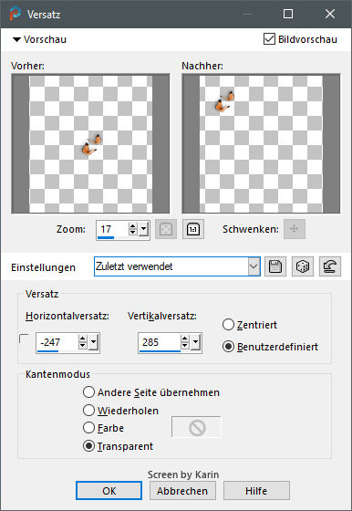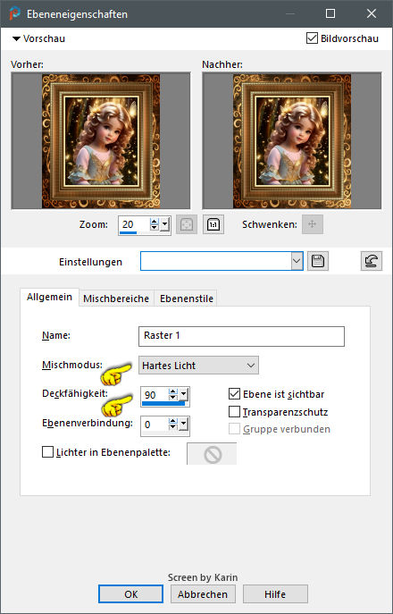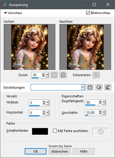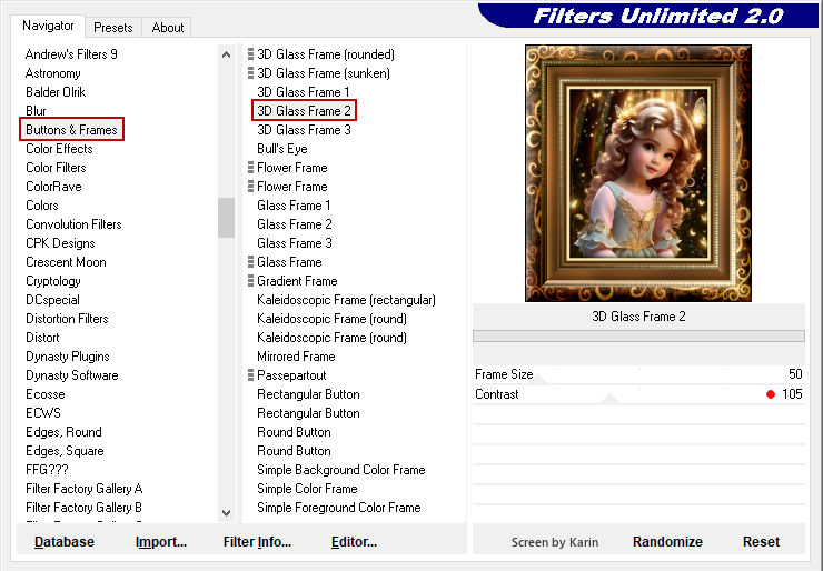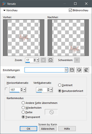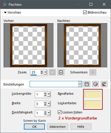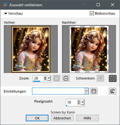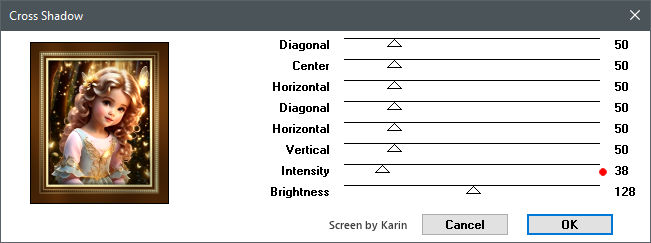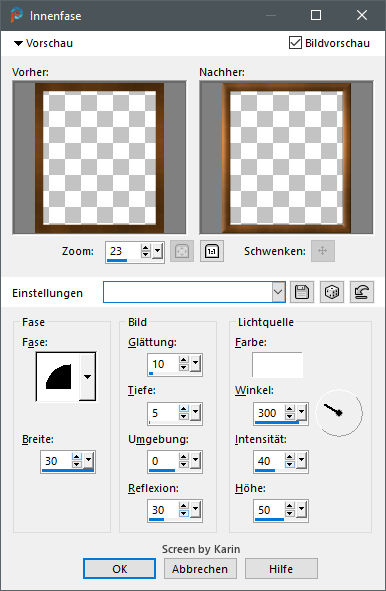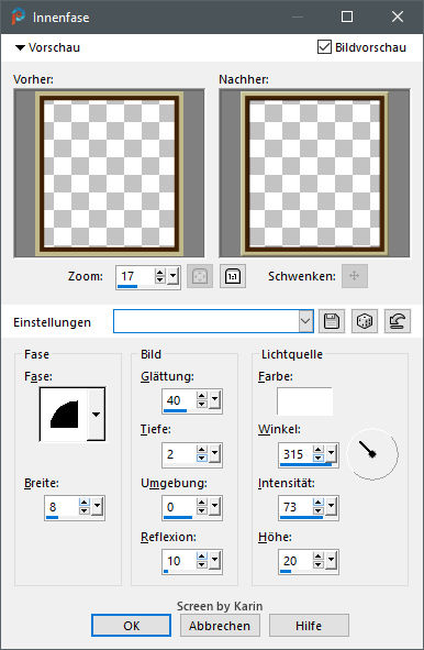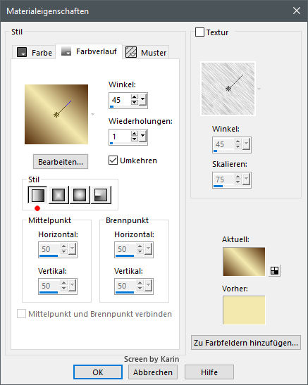 ![]() Rahmentutorial "Angel" Übersetzung mit PSP 2020, im Juni 2024 ![]() Benötigt wird das Material von Ria, das mit Klick auf den roten Ordner heruntergeladen werden kann. Das Copyright der genutzten Materialien, liegt beim jeweiligen Künstler. Bitte respektiert das und gebt den Download-Inhalt nicht als euer Material aus. ![]() Inhalt: ![]() Externe Filter: Graphic Plus - Cross Shadow ScreenWorks - Grid Layout Filter Unlimited / VM Experimental - Magnetic Detection Filter Unlimited / Buttons & Frames - 3D Glass Frame 2 Vorbereitung: Die Originalfarben vom Tutorial sind: ![]() Kopiere die Farbkästchen (Rechtsklick - Bild kopieren) und füge sie auf deinem Arbeitsplatz im PSP ein, dann kannst du einfach mit der Pipette die jeweilige Farbe anklicken. Wähle eine helle und eine dunkle Farbe aus deinem Bild, oder eben die Originalfarben. In der Materialpalette Hell als Vordergrundfarbe, Dunkel als Hintergrundfarbe einstellen. Erstelle damit (z.B. bei "Vordergrund") folgenden Farbverlauf: Einstellungen siehe Screenshot ![]() Öffne das heruntergeladene Material in deinem PSP, dupliziere es, wir arbeiten mit den Duplikaten. Oder benutze eigenes Material in der passenden Größe, dann bitte die Farben an dein Material anpassen. ********************************************************************* Das Lineal kann als Orientierungshilfe mit der linken Maustaste mitgezogen werden. ![]() Schritt 1 Öffne das Bild "happy.jpg" (aus dem Downloadmaterial) Bild / Rand hinzufügen 9 px Vordergrundfarbe 9 px Hintergrundfarbe Auswahl / Alle auswählen Auswahl / Ändern - Verkleinern Einstellung siehe Screenshot ![]() Effekte / 3D-Effekte - Aussparung Einstellungen siehe Screenshot ![]() Wiederhole Effekte / 3D-Effekte - Aussparung Jetzt aber Vertikal und Horizontal mit Minuswerten, also -5 Auswahl / Auswahl aufheben Schritt 2 Bild / Rand hinzufügen 1 px Vordergrundfarbe 2 px Hintergrundfarbe 1 px Vordergrundfarbe Auswahl / Alle auswählen Bild / Rand hinzufügen 9 px Hintergrundfarbe Auswahl / Umkehren Diese Auswahl mit dem Farbverlauf (siehe Vorbereitung) befüllen Effekte / Plugins / ScreenWorks - Grid Layout Den Filter nur anklicken, es gibt keine einstellbaren Werte Auswahl / Auswahl aufheben Bild / Rand hinzufügen 1 px Vordergrundfarbe 2 px Hintergrundfarbe 1 px Vordergrundfarbe Schritt 3 Bild / Rand hinzufügen 35 px Hintergrundfarbe Diesen Rand mit dem Zauberstab markieren Effekte / Plugins / Graphic Plus - Cross Shadow Einstellungen siehe Screenshot ![]() Effekte / Textureffekte - Flechten Einstellungen siehe Screenshot ![]() Effekte / 3D-Effekte - Innenfase (Fase 2) Einstellungen siehe Screenshot ![]() Auswahl / Auswahl aufheben Schritt 4 Bild / Rand hinzufügen 1 px Vordergrundfarbe 2 px Hintergrundfarbe 1 px Vordergrundfarbe Auswahl / Alle auswählen Bild / Rand hinzufügen 9 px Hintergrundfarbe Auswahl / Umkehren Diese Auswahl mit dem Farbverlauf befüllen Effekte / Plugins / ScreenWorks - Grid Layout Den Filter nur anklicken, es gibt keine einstellbaren Werte Auswahl / Auswahl aufheben Bild / Rand hinzufügen 1 px Vordergrundfarbe 2 px Hintergrundfarbe 1 px Vordergrundfarbe Schritt 5 Bild / Rand hinzufügen 45 px Hintergrundfarbe Diesen Rand mit dem Zauberstab markieren Und mit dem Farbverlauf befüllen Ebenen / Neue Rasterebene Öffne das Bild "background290.jpg" Bearbeiten / Kopieren Zurück zum Arbeitsblatt Bearbeiten / In eine Auswahl einfügen Ebenen / Eigenschaften Einstellungen siehe Screenshot ![]() Ebenen / Zusammenführen - Nach unten zusammenfassen Effekte / Plugins / Filter Unlimited / Buttons & Frames - 3D Glass Frame 2 Einstellungen siehe Screenshot ![]() Auswahl / Auswahl aufheben Schritt 6 Bild / Rand hinzufügen 1 px Vordergrundfarbe 2 px Hintergrundfarbe 1 px Vordergrundfarbe Auswahl / Alle auswählen Bild / Rand hinzufügen 9 px Hintergrundfarbe Auswahl / Umkehren Diese Auswahl mit dem Farbverlauf befüllen Effekte / Plugins / ScreenWorks - Grid Layout Den Filter nur anklicken, es gibt keine einstellbaren Werte Auswahl / Auswahl aufheben Bild / Rand hinzufügen 1 px Vordergrundfarbe 2 px Hintergrundfarbe 1 px Vordergrundfarbe Schritt 7 Auswahl / Alle auswählen Bild / Rand hinzufügen 25 px Hintergrundfarbe 25 px Vordergrundfarbe Auswahl / Umkehren Effekte / Plugins / Filter Unlimited / VM Experimental - Magnetic Detection Mit den Standardeinstellungen Siehe Screenshot ![]() Effekte / 3D-Effekte - Innenfase (Fase 2) Einstellungen siehe Screenshot ![]() Auswahl / Auswahl aufheben Bild / Rand hinzufügen 2 px Hintergrundfarbe Schritt 8 Öffne die Tube "tekst-Angel-Ri@.png" Bearbeiten / Kopieren Zurück zum Arbeitsblatt Bearbeiten / Als neue Ebene einfügen Effekte / Bildeffekte - Versatz Einstellungen siehe Screenshot ![]() Öffne die Tube "butterflies.png" Bearbeiten / Kopieren Zurück zum Arbeitsblatt Bearbeiten / Als neue Ebene einfügen Effekte / Bildeffekte - Versatz Einstellungen siehe Screenshot ![]() Setze noch dein Wasserzeichen, oder Copy auf das Bild Ebenen / Zusammenführen - Alle zusammenfassen Bild / Größe ändern längste Seite auf 600 Pixel (Oder nach deinem Belieben) Schärfe dein Bild eventuell nach Einstellen / Schärfe / Scharfzeichnen Nun ist die Arbeit geschafft, ich hoffe es hat ein bisschen Spaß gemacht. Danke an Ria ![]() Weitere Beispiele: ![]() Dankeschön liebe Doris ![]() ![]() ![]() |