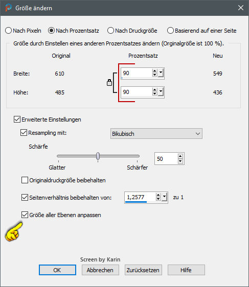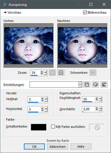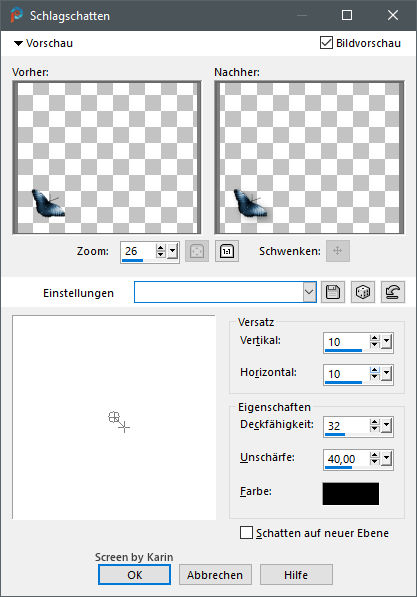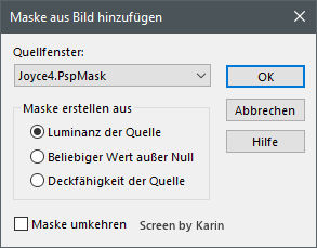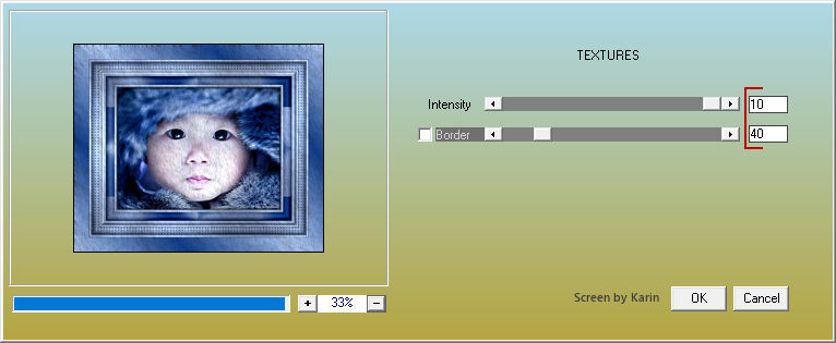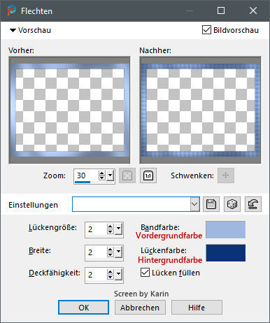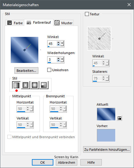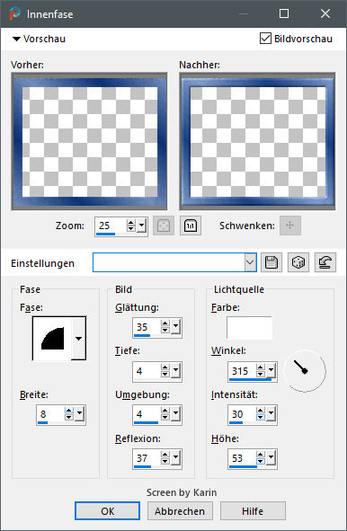 ![]() Rahmentutorial "Beauty" Übersetzung mit PSP 2020, im Juni 2024 ![]() Benötigt wird das Material von Ria, das mit Klick auf den roten Ordner heruntergeladen werden kann. Das Copyright der genutzten Materialien, liegt beim jeweiligen Künstler. Bitte respektiert das und gebt den Download-Inhalt nicht als euer Material aus. ![]() Inhalt: ![]() Externe Filter: Graphic Plus / Cross Shadow Filter Unlimited / Buttons & Frames - Glass Frame 1 Filter Unlimited / Buttons & Frames - Glass Frame 2 Border Mania / Frame #2 Alien Skin Eye Candy / Weave AAA Filters / Textures FM Tile Tools / Blend Emboss Vorbereitung: Die Originalfarben vom Tutorial sind: ![]() Kopiere die Farbkästchen (Rechtsklick - Bild kopieren) und füge sie auf deinem Arbeitsplatz im PSP ein, dann kannst du einfach mit der Pipette die jeweilige Farbe anklicken. Wähle eine hellere und eine dunklere Farbe aus deinem Bild, oder eben die Originalfarben. In der Materialpalette Hell als Vordergrundfarbe, Dunkel als Hintergrundfarbe einstellen. Erstelle damit (z.B. bei "Vordergrund") folgenden Farbverlauf: Einstellungen siehe Screenshot ![]() Öffne das heruntergeladene Material in deinem PSP, dupliziere es, wir arbeiten mit den Duplikaten. Oder benutze eigenes Material in der passenden Größe, dann bitte die Farben an dein Material anpassen. ********************************************************************* Das Lineal kann als Orientierungshilfe mit der linken Maustaste mitgezogen werden. Schritt 1 Öffne das Bild "113411604.jpg" (aus dem Downloadmaterial) Bild / Größe ändern Siehe Screenshot ![]() Einstellen / Schärfe - Scharfzeichnen Wiederhole Einstellen / Schärfe - Scharfzeichnen Bild / Rand hinzufügen 1 px Extrafarbe - Schwarz Auswahl / Alle auswählen Effekte / 3D-Effekte - Aussparung Einstellungen siehe Screenshot ![]() Wiederhole Effekte / 3D-Effekte - Aussparung Jetzt aber Vertikal und Horizontal mit Minuswerten Auswahl / Auswahl aufheben Schritt 2 Bild / Rand hinzufügen 1 px Vordergrundfarbe 1 px Extrafarbe - Schwarz 6 px Vordergrundfarbe Diesen Rand mit dem Zauberstab markieren Effekte / Plugins / Graphic Plus - Cross Shadow Einstellungen siehe Screenshot ![]() Effekte / Plugins / Filter Unlimited / Buttons & Frames - Glass Frame 1 Einstellungen siehe Screenshot ![]() Auswahl / Auswahl aufheben Schritt 3 Bild / Rand hinzufügen 25 px Vordergrundfarbe Diesen Rand mit dem Zauberstab markieren Effekte / Plugins / Graphic Plus - Cross Shadow Einstellungen wie oben bei Schritt 2 (Intensity 50) Effekte / Textureffekte - Flechten Einstellungen siehe Screenshot ![]() Ebenen / Neue Rasterebene Diese Ebene mit der Hintergrundfarbe befüllen Ebenen / Neue Maskenebene - Aus Bild Wähle die Maske "Joyce4.PspMask" Einstellung siehe Screenshot ![]() Ebenen / Zusammenführen - Gruppe zusammenfassen Ebenen / Zusammenführen - Nach unten zusammenführen Effekte / Plugins / Filter Unlimited / Buttons & Frames - Glass Frame 2 Mit der Standardeinstellung Siehe Screenshot ![]() Auswahl / Auswahl aufheben Schritt 4 Bild / Rand hinzufügen 1 px Extrafarbe - Schwarz 12 px Vordergrundfarbe Diesen Rand mit dem Zauberstab markieren Effekte / Plugins / Graphic Plus - Cross Shadow Einstellungen wie oben bei Schritt 3 (Intensity 50) Effekte / Plugins / Border Mania - Frame #2 Einstellungen siehe Screenshot ![]() Auswahl / Auswahl aufheben Bild / Rand hinzufügen 1 px Vordergrundfarbe 1 px Extrafarbe - Schwarz 6 px Vordergrundfarbe Diesen Rand mit dem Zauberstab markieren Effekte / Plugins / Graphic Plus - Cross Shadow Einstellungen wie eben (Intensity 50) Effekte / Plugins / Filter Unlimited / Buttons & Frames - Glass Frame 1 Einstellungen siehe Screenshot ![]() Auswahl / Auswahl aufheben Schritt 5 Bild / Größe ändern Einstellungen siehe Screenshot ![]() Bild / Rand hinzufügen 20 px Vordergrundfarbe Diesen Rand mit dem Zauberstab markieren Effekte / Plugins / Graphic Plus - Cross Shadow Einstellungen wie oben bei Schritt 4 (Intensity 50) Effekte / Plugins / Alien Skin Eye Candy - Weave Einstellungen siehe Screenshot ![]() Effekte / Plugins / Filter Unlimited / Buttons & Frames - Glass Frame 2 Mit den Standardwerten Siehe Screenshot ![]() Auswahl / Auswahl aufheben Schritt 6 Bild / Rand hinzufügen 1 px Vordergrundfarbe 1 px Extrafarbe - Schwarz 6 px Vordergrundfarbe Diesen Rand mit dem Zauberstab markieren Effekte / Plugins / Graphic Plus - Cross Shadow Einstellungen wie oben bei Schritt 5 (Intensity 50) Effekte / Plugins / Filter Unlimited / Buttons & Frames - Glass Frame 1 Einstellungen siehe Screenshot ![]() Auswahl / Auswahl aufheben Schritt 7 Bild / Rand hinzufügen 40 px Vordergrundfarbe Diesen Rand mit dem Zauberstab markieren Und mit dem Farbverlauf (siehe Vorbereitung) befüllen Effekte / Plugins / AAA Filters - Textures Einstellungen siehe Screenshot ![]() Effekte / Plugins / FM Tile Tools - Blend Emboss Mit den Standardeinstellungen Siehe Screenshot ![]() Effekte / Textureffekte - Flechten Einstellungen wie noch von Schritt 3 Effekte / 3D-Effekte - Innenfase (Fase 2) Einstellungen siehe Screenshot ![]() Auswahl / Auswahl aufheben Bild / Rand hinzufügen 1 px Vordergrundfarbe 1 px Extrafarbe - Schwarz 6 px Vordergrundfarbe Diesen Rand mit dem Zauberstab markieren Effekte / Plugins / Graphic Plus - Cross Shadow Einstellungen wie oben bei Schritt 6 (Intensity 50) Effekte / Plugins / Filter Unlimited / Buttons & Frames - Glass Frame 1 Einstellungen siehe Screenshot ![]() Auswahl / Auswahl aufheben Schritt 8 Öffne die Tube "Butterfly.pspimage" Bearbeiten / Kopieren Zurück zum Arbeitsblatt Bearbeiten / Als neue Ebene einfügen Platziere die Tube links unten Siehe Screenshot ![]() Einstellen / Schärfe - Scharfzeichnen Effekte / 3D-Effekte - Schlagschatten Einstellungen siehe Screenshot ![]() Öffne die Tube "dekor01@Ria.pspimage" Bearbeiten / Kopieren Zurück zum Arbeitsblatt Bearbeiten / Als neue Ebene einfügen Platziere die Tube rechts oben Siehe Screenshot ![]() Setze noch dein Wasserzeichen, oder Copy auf das Bild Ebenen