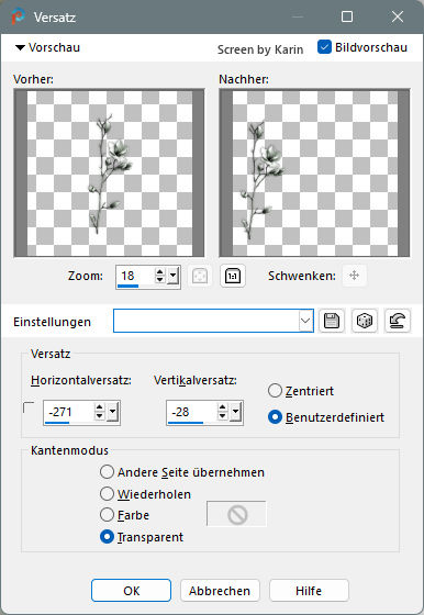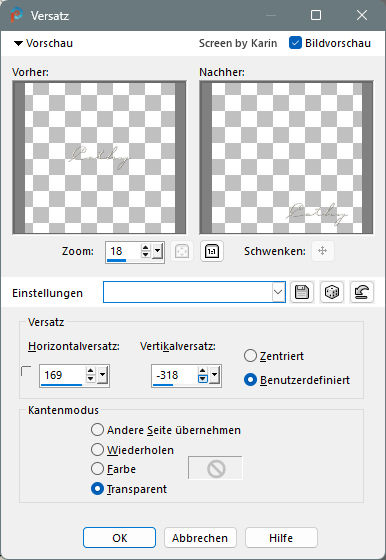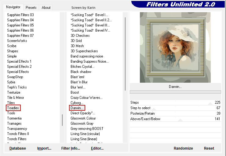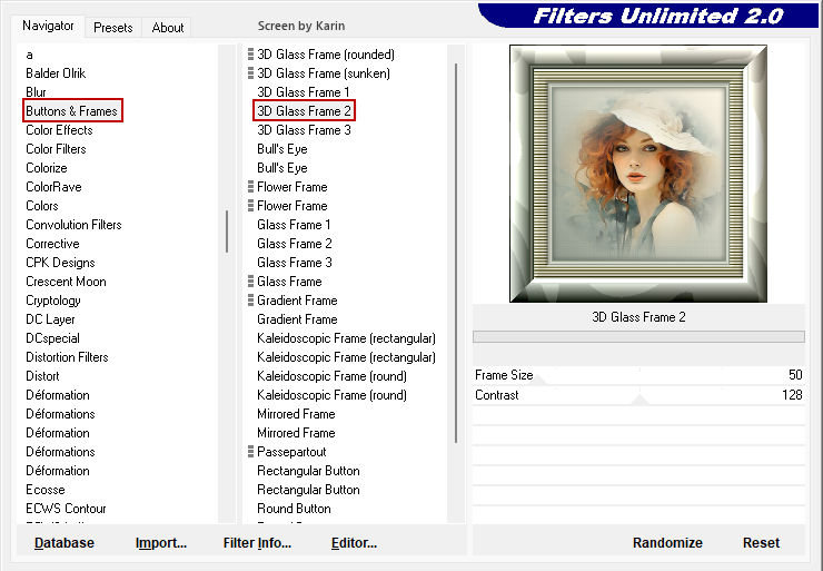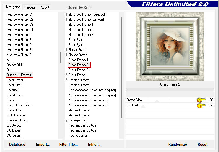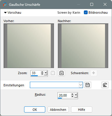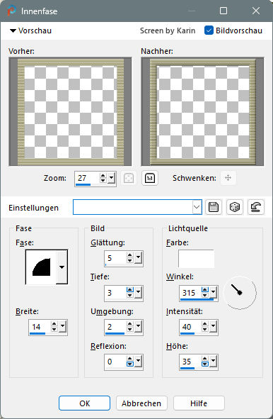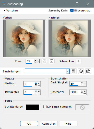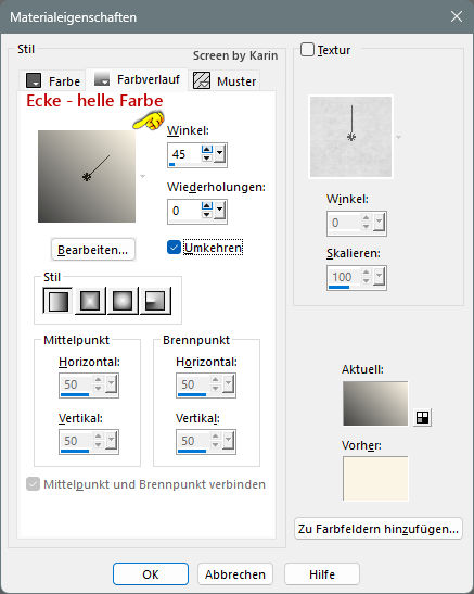 ![]() Rahmentutorial "Cathy" Übersetzung mit PSP 2020, im September 2025 ![]() Benötigt wird das Material von Ria, das mit Klick auf den roten Ordner heruntergeladen werden kann. Das Copyright der genutzten Materialien, liegt beim jeweiligen Künstler. Bitte respektiert das und gebt den Download-Inhalt nicht als euer Material aus. ![]() Inhalt: ![]() Externe Filter: Graphic Plus / Cross Shadow Filters Unlimited / &<Bkg Designer sf10 I> / Centripedal Tile Carolaine & Sensibility / CS-LDots Filters Unlimited / Neologie / Lineart Filters Unlimited / Toadies / Darwin Filters Unlimited / Buttons & Frames / 3D Glass Frame 2 Filters Unlimited / Buttons & Frames / Glass Frame 2 Vorbereitung: Die Originalfarben vom Tutorial sind: ![]() Kopiere die Farbkästchen (Rechtsklick - Bild kopieren) und füge sie auf deinem Arbeitsplatz im PSP ein, dann kannst du einfach mit der Pipette die jeweilige Farbe anklicken. Wähle eine helle und eine dunkle Farbe aus deinem Bild, oder eben die Originalfarben. In der Materialpalette Hell als Vordergrundfarbe, Dunkel als Hintergrundfarbe einstellen. Erstelle damit (z.B. bei "Vordergrund") folgenden Farbverlauf: Einstellungen siehe Screenshot ![]() Öffne das heruntergeladene Material in deinem PSP, dupliziere es, wir arbeiten mit den Duplikaten. Oder benutze eigenes Material in der passenden Größe, dann bitte die Farben an dein Material anpassen. Alle Angaben zum Versatz, oder Filtereinstellungen, beziehen sich auf die Materialien und Bildgrößen vom Original-Tutorial. Wenn eigene Materialen verwendet werden, ist es vielleicht hilfreich, oder notwendig, sich an dem Vorschaubild zu orientieren. ********************************************************************* Das Lineal kann als Orientierungshilfe mit der linken Maustaste mitgezogen werden. ![]() Schritt 1 Öffne eine neue transparente Leinwand in der Größe 450px x 450px Datei / Neu Siehe Screenshot ![]() Befülle diese Leinwand mit dem Farbverlauf (siehe Vorbereitung) Einstellen / Unschärfe - Gaußsche Unschärfe Einstellung siehe Screenshot ![]() Effekte / Plugins / Carolaine & Sensibility - CS-LDots Mit den Standardeinstellungen Siehe Screenshot ![]() Öffne die Tube aus dem Downloadmaterial "Cathy-tubed by Ri@.png" Bearbeiten / Kopieren Zurück zur erstellten Leinwand Bearbeiten / Als neue Ebene einfügen Ebenen / Zusammenführen - Alle zusammenfassen Auswahl / Alle auswählen Effekte / 3D-Effekte - Aussparung Einstellungen siehe Screenshot ![]() Auswahl / Auswahl aufheben Schritt 2 Bild / Rand hinzufügen 4 px Hintergrundfarbe 2 px Vordergrundfarbe 2 px Hintergrundfarbe 2 px Vordergrundfarbe 4 px Hintergrundfarbe Schritt 3 Bild / Rand hinzufügen 35 px Vordergrundfarbe Diesen Rand mit dem Zauberstab markieren Effekte / Plugins / Filters Unlimited / Neologie - Lineart Einstellungen siehe Screenshot ![]() Effekte / 3D-Effekte - Innenfase (Fase 2) Einstellungen siehe Screenshot ![]() Auswahl / Auswahl aufheben Schritt 4 Bild / Rand hinzufügen 4 px Hintergrundfarbe 2 px Vordergrundfarbe 2 px Hintergrundfarbe 2 px Vordergrundfarbe 4 px Hintergrundfarbe Schritt 5 Bild / Rand hinzufügen 50 px Vordergrundfarbe Diesen Rand mit dem Zauberstab markieren Und mit dem Farbverlauf befüllen Effekte / Plugins / Graphics Plus - Cross Shadow Einstellungen siehe Screenshot ![]() Effekte / Plugins / Filters Unlimited / Toadies - Darwin Mit den Standardeinstellungen Siehe Screenshot ![]() Effekte / Plugins / Filters Unlimited / Buttons & Frames - 3D Glass Frame 2 Mit den Standardeinstellungen Siehe Screenshot ![]() Auswahl / Auswahl aufheben Schritt 6 Bild / Rand hinzufügen 4 px Hintergrundfarbe 2 px Vordergrundfarbe 2 px Hintergrundfarbe 2 px Vordergrundfarbe 4 px Hintergrundfarbe Schritt 7 Bild / Rand hinzufügen 55 px Vordergrundfarbe Diesen Rand mit dem Zauberstab markieren Effekte / Plugins / Filters Unlimited / &<Bkg Designer sf10 I> - Centripedal Tile Einstellungen siehe Screenshot ![]() Effekte / Plugins / Filters Unlimited / Buttons & Frames - Glass Frame 2 Einstellungen siehe Screenshot ![]() Auswahl / Auswahl aufheben Schritt 8 Bild / Rand hinzufügen 4 px Hintergrundfarbe 2 px Vordergrundfarbe 2 px Hintergrundfarbe 2 px Vordergrundfarbe 4 px Hintergrundfarbe Schritt 9 Öffne die Tube "tekst-cathy-Ri@.png" Bearbeiten / Kopieren Zurück zum Hauptbild Bearbeiten / Als neue Ebene einfügen Effekte / Bildeffekte - Versatz Einstellungen siehe Screenshot ![]() Schritt 12 Öffne die Tube "flower branch.png" Bearbeiten / Kopieren Zurück zum Hauptbild Effekte / Bildeffekte - Versatz Einstellungen siehe Screenshot ![]() Setze noch dein Wasserzeichen, oder Copy auf das Bild Ebenen / Zusammenführen - Alle zusammenfassen Bild / Größe ändern (Ich habe mein Bild auf 85% verkleinert) Oder nach deinem Belieben Schärfe dein Bild eventuell nach Einstellen / Schärfe / Scharfzeichnen Nun ist die Arbeit geschafft, ich hoffe es hat ein bisschen Spaß gemacht. Danke an Ria ![]() Weitere Beispiele: ![]() ![]() ![]() |