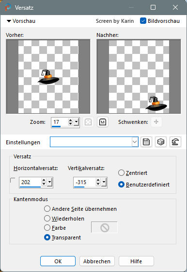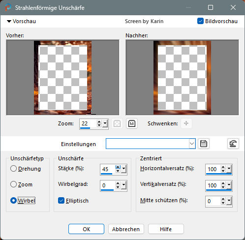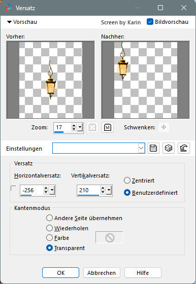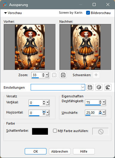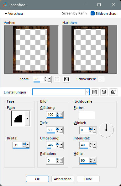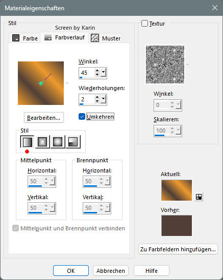 ![]() Rahmentutorial "Elena" Übersetzung mit PSP 2020, im Oktober 2025 ![]() Benötigt wird das Material von Ria, das mit Klick auf den roten Ordner heruntergeladen werden kann. Das Copyright der genutzten Materialien, liegt beim jeweiligen Künstler. Bitte respektiert das und gebt den Download-Inhalt nicht als euer Material aus. ![]() Inhalt: ![]() Externe Filter: Filters Unlimited / ScreenWorks / Aged Mosaic Graphics Plus / Cross Shadow Filters Unlimited / Filter Factory Gallery G / Bevel 1.5 Vorbereitung: Die Originalfarben vom Tutorial sind: ![]() Kopiere die Farbkästchen (Rechtsklick - Bild kopieren) und füge sie auf deinem Arbeitsplatz im PSP ein, dann kannst du einfach mit der Pipette die jeweilige Farbe anklicken. Wähle eine dunkle und eine helle Farbe aus deinem Bild, oder eben die Originalfarben. In der Materialpalette Dunkel als Vordergrundfarbe, Hell als Hintergrundfarbe einstellen. Erstelle damit (z.B. bei "Vordergrund") folgenden Farbverlauf: Einstellungen siehe Screenshot ![]() Öffne das heruntergeladene Material in deinem PSP, dupliziere es, wir arbeiten mit den Duplikaten. Oder benutze eigenes Material in der passenden Größe, dann bitte die Farben an dein Material anpassen. Alle Angaben zum Versatz, oder Filtereinstellungen, beziehen sich auf die Materialien und Bildgrößen vom Original-Tutorial. Wenn eigene Materialen verwendet werden, ist es vielleicht hilfreich, oder notwendig, sich an dem Vorschaubild zu orientieren. ********************************************************************* Das Lineal kann als Orientierungshilfe mit der linken Maustaste mitgezogen werden. Schritt 1 Öffne das Bild "Elena.jpg" aus dem Download-Material Auswahl / Alle auswählen Effekte / 3D-Effekte - Aussparung Einstellungen siehe Screenshot ![]() Auswahl / Auswahl aufheben Schritt 2 Bild / Rand hinzufügen 1 px helle Farbe 1 px dunkle Farbe 4 px helle Farbe 1 px dunkle Farbe 1 px helle Farbe 5 px dunkle Farbe Diesen Rand mit dem Zauberstab markieren Effekte / Plugins / Filters Unlimited / ScreenWorks - Aged Mosaic Es gibt keine Werte zum einstellen Siehe Screenshot ![]() Auswahl / Auswahl aufheben Bild / Rand hinzufügen 1 px helle Farbe 1 px dunkle Farbe 4 px helle Farbe 1 px dunkle Farbe 1 px helle Farbe Schritt 3 Auswahl / Alle auswählen Bild / Rand hinzufügen 30 px helle Farbe Auswahl / Umkehren Effekte / Plugins / Filters Unlimited / ScreenWorks - Aged Mosaic Es gibt keine Werte zum einstellen Effekte / 3D-Effekte - Aussparung Wie bereits eingestellt, siehe Schritt 1 Auswahl / Auswahl aufheben Schritt 4 Bild / Rand hinzufügen 1 px helle Farbe 1 px dunkle Farbe 4 px helle Farbe 1 px dunkle Farbe 1 px helle Farbe 5 px dunkle Farbe Diesen Rand mit dem Zauberstab markieren Effekte / Plugins / Filters Unlimited / ScreenWorks - Aged Mosaic Es gibt keine Werte zum einstellen Auswahl / Auswahl aufheben Bild / Rand hinzufügen 1 px helle Farbe 1 px dunkle Farbe 4 px helle Farbe 1 px dunkle Farbe 1 px helle Farbe Schritt 5 Auswahl / Alle auswählen Bild / Rand hinzufügen 40 px helle Farbe Auswahl / Umkehren Öffne das Bild "Elena2.jpg" aus dem Download-Material Bearbeiten / Kopieren Zurück zum Hauptbild Bearbeiten / In eine Auswahl einfügen Einstellen / Unschärfe - Strahlenförmige Unschärfe Einstellungen siehe Screenshot ![]() Ebenen / Neue Rasterebene Befülle diese Ebene mit der Extrafarbe Schwarz (#000000) Ebenen / Neue Maskenebene aus Bild Wähle nun die Maske "Ri@masker04062018-37.jpg" aus dem Download-Material Siehe Screenshot ![]() Effekte / Kanteneffekte - Nachzeichnen Ebenen / Zusammenführen - Gruppe zusammenfassen Einstellen / Schärfe - Scharfzeichnen Ebenen / Zusammenführen - Alle zusammenfassen Effekte / 3D-Effekte - Innenfase (Fase 2) Einstellungen siehe Screenshot ![]() Auswahl / Auswahl aufheben Schritt 6 Bild / Rand hinzufügen 1 px helle Farbe 1 px dunkle Farbe 4 px helle Farbe 1 px dunkle Farbe 1 px helle Farbe 5 px dunkle Farbe Diesen Rand mit dem Zauberstab markieren Effekte / Plugins / Filters Unlimited / ScreenWorks - Aged Mosaic Es gibt keine Werte zum einstellen Auswahl / Auswahl aufheben Bild / Rand hinzufügen 1 px helle Farbe 1 px dunkle Farbe 4 px helle Farbe 1 px dunkle Farbe 1 px helle Farbe Schritt 7 Auswahl / Alle auswählen Bild / Rand hinzufügen 50 px dunkle Farbe Auswahl / Umkehren Diesen Rand mit dem Farbverlauf befüllen (siehe Vorbereitung) Effekte / Plugins / Graphics Plus - Cross Shadow Einstellungen siehe Screenshot ![]() Effekte / Plugins / Filters Unlimited / Filter Factory Gallery G - Bevel 1.5 Mit den Standardeinstellungen, siehe Screenshot ![]() Auswahl / Auswahl aufheben Schritt 8 Bild / Rand hinzufügen 1 px helle Farbe 1 px dunkle Farbe 4 px helle Farbe 1 px dunkle Farbe 1 px helle Farbe 5 px dunkle Farbe Diesen Rand mit dem Zauberstab markieren Effekte / Plugins / Filters Unlimited / ScreenWorks - Aged Mosaic Es gibt keine Werte zum einstellen Auswahl / Auswahl aufheben Bild / Rand hinzufügen 1 px helle Farbe 1 px dunkle Farbe 4 px helle Farbe 1 px dunkle Farbe 1 px helle Farbe Schritt 9 Öffne die Tube "hat-elena.png" Bearbeiten / Kopieren Zurück zum Hauptbild Bearbeiten / Als neue Ebene einfügen Effekte / Bildeffekte - Versatz Einstellungen siehe Screenshot ![]() Öffne die Tube "lantern.png" Bearbeiten / Kopieren Zurück zum Hauptbild Bearbeiten / Als neue Ebene einfügen Effekte / Bildeffekte - Versatz Einstellungen siehe Screenshot ![]() Setze noch dein Wasserzeichen, oder Copy auf das Bild Ebenen / Zusammenführen - Alle zusammenfassen Bild / Größe ändern (Ich habe mein Bild auf 85% verkleinert) Oder nach deinem Belieben Schärfe dein Bild eventuell nach Einstellen / Schärfe / Scharfzeichnen Nun ist die Arbeit geschafft, ich hoffe es hat ein bisschen Spaß gemacht. Danke an Ria ![]() Weitere Beispiele: ![]() |