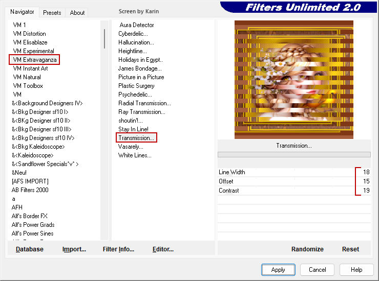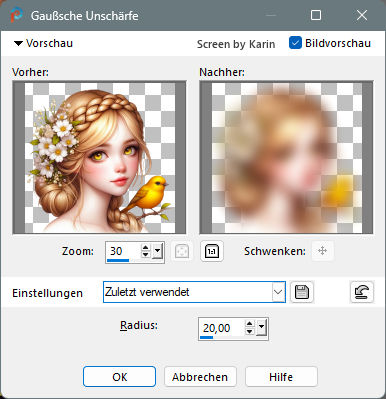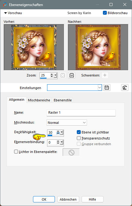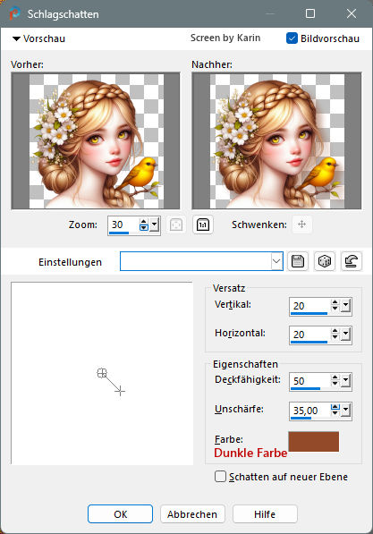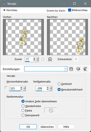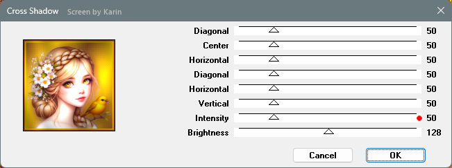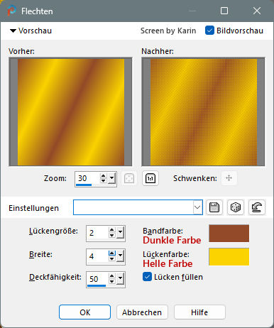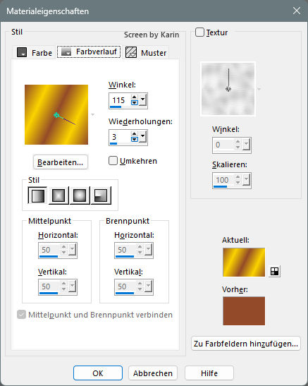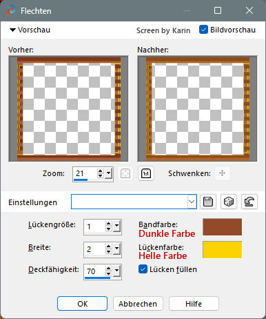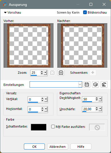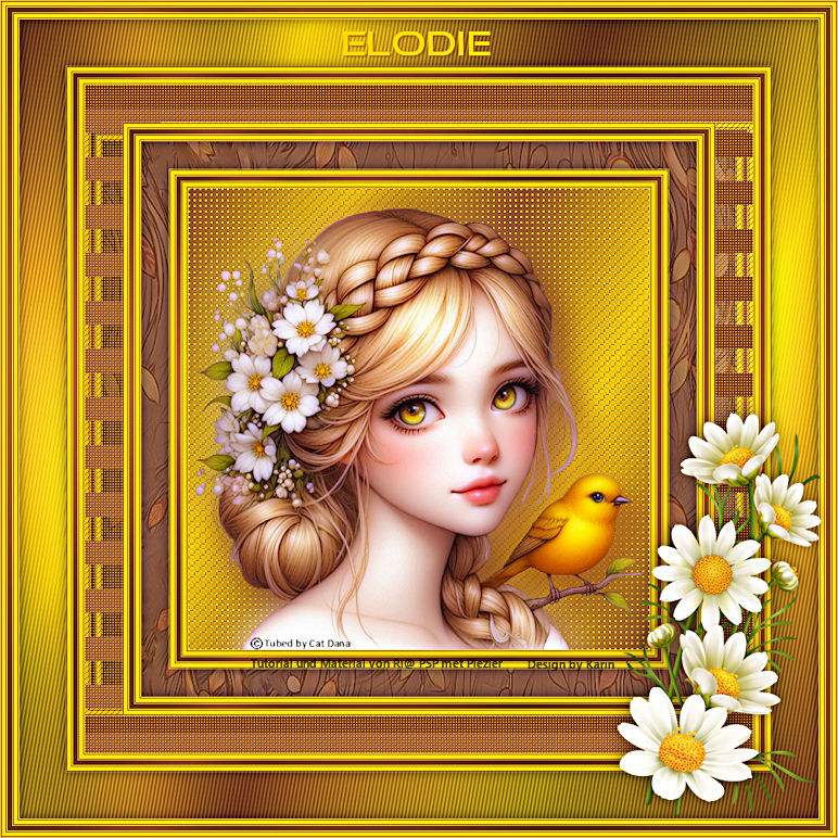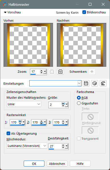 ![]() Rahmentutorial "Elodie" Übersetzung mit PSP 2020, im November 2025 ![]() Benötigt wird das Material von Ria, das mit Klick auf den roten Ordner heruntergeladen werden kann. Das Copyright der genutzten Materialien, liegt beim jeweiligen Künstler. Bitte respektiert das und gebt den Download-Inhalt nicht als euer Material aus. ![]() Inhalt: ![]() Externe Filter: Xero / Porcelain Graphics Plus / Cross Shadow Filters Unlimited / VM Extravaganza / Transmission Vorbereitung: Die Originalfarben vom Tutorial sind: ![]() Kopiere die Farbkästchen (Rechtsklick - Bild kopieren) und füge sie auf deinem Arbeitsplatz im PSP ein, dann kannst du einfach mit der Pipette die jeweilige Farbe anklicken. Wähle eine dunkle und eine helle Farbe aus deinem Bild, oder eben die Originalfarben. In der Materialpalette Dunkel als Vordergrundfarbe, Hell als Hintergrundfarbe einstellen. Erstelle damit (z.B. bei "Vordergrund") folgenden Farbverlauf: Einstellungen siehe Screenshot ![]() Öffne das heruntergeladene Material in deinem PSP, dupliziere es, wir arbeiten mit den Duplikaten. Oder benutze eigenes Material in der passenden Größe, dann bitte die Farben an dein Material anpassen. Alle Angaben zum Versatz, oder Filtereinstellungen, beziehen sich auf die Materialien und Bildgrößen vom Original-Tutorial. Wenn eigene Materialen verwendet werden, ist es vielleicht hilfreich, oder notwendig, sich an dem Vorschaubild zu orientieren. ********************************************************************* Das Lineal kann als Orientierungshilfe mit der linken Maustaste mitgezogen werden. Schritt 1 Erstelle eine neue Leinwand Datei / Neu Siehe Screenshot ![]() Befülle den Hintergrund mit dem Farbverlauf, siehe Vorbereitung Effekte / Textureffekte - Flechten Einstellungen siehe Screenshot ![]() Einstellen / Schärfe - Scharfzeichnen Aktiviere die Tube "tubed-by-Cat-Dana.png" Bearbeiten / Kopieren Zurück zum Hauptbild Bearbeiten / Als neue Ebene einfügen Schiebe die Tube etwas nach unten, sodass kein Rand mehr sichtbar ist (Ich habe das Copy anders plaziert) Dupliziere nun die Tube Ebene / Duplizieren Einstellen / Unschärfe - Gaußsche Unschärfe Einstellungen siehe Screenshot ![]() Im Ebenenmanager sieht es jetzt so aus Siehe Screenshot ![]() Ebenen / Anordnen - nach unten verschieben Jetzt muss es im Ebenenmanager so aussehen Siehe Screenshot ![]() Aktiviere die Ebene "Raster 2" (Im Ebenenmanager anklicken) Effekte / 3D-Effekte - Schlagschatten Einstellungen siehe Screenshot ![]() Effekte / 3D-Effekte / Xero - Porcelain Mit den Standardwerten, siehe Screenshot ![]() Ebenen Zusammenführen - Alle zusammenfassen Schritt 2 Bild / Rand hinzufügen 1 px helle Farbe 1 px dunkle Farbe 4 px helle Farbe 1 px dunkle Farbe 1 px helle Farbe 5 px dunkle Farbe Diesen Rand mit dem Zauberstab markieren Effekte / Plugins / Graphics Plus - Cross Shadow Einstellungen siehe Screenshot ![]() Auswahl / Auswahl aufheben Bild / Rand hinzufügen 1 px helle Farbe 1 px dunkle Farbe 4 px helle Farbe 1 px dunkle Farbe 1 px helle Farbe Schritt 3 Bild / Rand hinzufügen 30 px dunkle Farbe Diesen Rand mit dem Zauberstab markieren Ebene / Neue Rasterebene Aktiviere "paper.jpg" Bearbeiten / Kopieren Zurück zum Hauptbild Bearbeiten / In eine Auswahl einfügen Effekte / Kanteneffekte nachzeichnen Ebenen / Eigenschaften Einstellungen siehe Screenshot ![]() Ebenen zusammenführen / Alle zusammenfassen Effekte / 3D-Effekte - Aussparung Einstellungen siehe Screenshot ![]() Auswahl / Auswahl aufheben Schritt 4 Bild / Rand hinzufügen 1 px helle Farbe 1 px dunkle Farbe 4 px helle Farbe 1 px dunkle Farbe 1 px helle Farbe 5 px dunkle Farbe Diesen Rand mit dem Zauberstab markieren Effekte / Plugins / Graphics Plus - Cross Shadow Einstellungen wie bei Schritt 2 (Intensity auf 50) Auswahl / Auswahl aufheben Bild / Rand hinzufügen 1 px helle Farbe 1 px dunkle Farbe 4 px helle Farbe 1 px dunkle Farbe 1 px helle Farbe Schritt 5 Bild / Rand hinzufügen 40 px dunkle Farbe Diesen Rand mit dem Zauberstab markieren Effekte / Plugins / Filters Unlimited / VM Extravaganza - Transmission Einstellungen siehe Screenshot ![]() Effekte / Textureffekte - Flechten Einstellungen siehe Screenshot ![]() Auswahl / Auswahl aufheben Schritt 6 Bild / Rand hinzufügen 1 px helle Farbe 1 px dunkle Farbe 4 px helle Farbe 1 px dunkle Farbe 1 px helle Farbe 5 px dunkle Farbe Diesen Rand mit dem Zauberstab markieren Effekte / Plugins / Graphics Plus - Cross Shadow Einstellungen wie bei Schritt 2 (Intensity auf 50) Auswahl / Auswahl aufheben Bild / Rand hinzufügen 1 px helle Farbe 1 px dunkle Farbe 4 px helle Farbe 1 px dunkle Farbe 1 px helle Farbe Schritt 7 Bild / Rand hinzufügen 50 px dunkle Farbe Diesen Rand mit dem Zauberstab markieren Mit dem Farbverlauf befüllen Effekte / Plugins / Graphics Plus - Cross Shadow Einstellungen wie bei Schritt 2 (Intensity auf 50) Effekte / Kunsteffekte - Halbtonraster Einstellungen siehe Screenshot ![]() Effekte / 3D-Effekte - Aussparung Wie bereits eingestellt, siehe Schritt 3 Auswahl / Auswahl aufheben Schritt 8 Bild / Rand hinzufügen 1 px helle Farbe 1 px dunkle Farbe 4 px helle Farbe 1 px dunkle Farbe 1 px helle Farbe 5 px dunkle Farbe Diesen Rand mit dem Zauberstab markieren Effekte / Plugins / Graphics Plus - Cross Shadow Einstellungen wie bei Schritt 2 (Intensity auf 50) Auswahl / Auswahl aufheben Bild / Rand hinzufügen 1 px helle Farbe 1 px dunkle Farbe 4 px helle Farbe 1 px dunkle Farbe 1 px helle Farbe Schritt 9 Öffne die Tube "flower branch.png" Bearbeiten / Kopieren Zurück zum Hauptbild Bearbeiten / Als neue Ebene einfügen Effekte / Bildeffekte - Versatz Einstellungen siehe Screenshot ![]() Öffne die Tube "tekst-elodie-Ri@.png" Bearbeiten / Kopieren Zurück zum Hauptbild Bearbeiten / Als neue Ebene einfügen Platziere den Text mittig in den oberen Rand Siehe Screenshot ![]() Objekt / Ausrichten - Horizontal zentriert Setze noch dein Wasserzeichen, oder Copy auf das Bild Ebenen / Zusammenführen - Alle zusammenfassen Bild / Gr