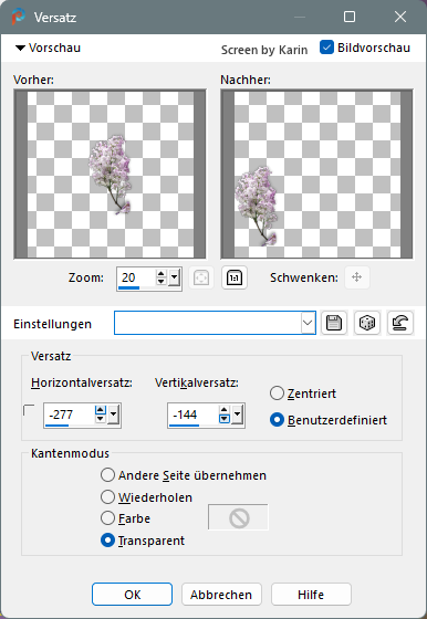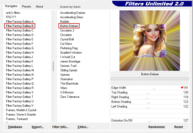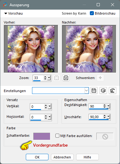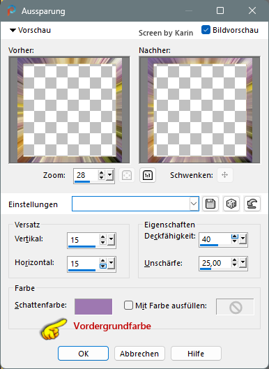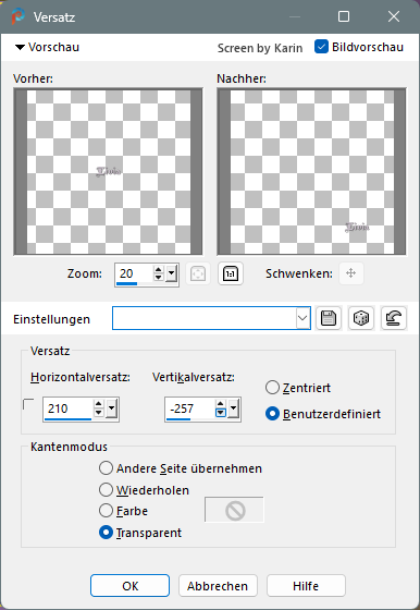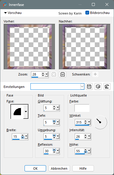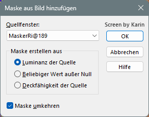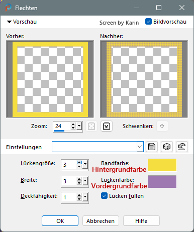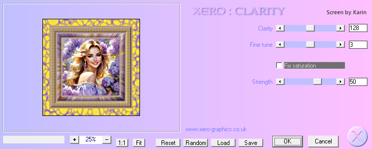 ![]() Rahmentutorial "Livia" Übersetzung mit PSP 2020, im März 2025 ![]() Benötigt wird das Material von Ria, das mit Klick auf den roten Ordner heruntergeladen werden kann. Das Copyright der genutzten Materialien, liegt beim jeweiligen Künstler. Bitte respektiert das und gebt den Download-Inhalt nicht als euer Material aus. ![]() Inhalt: ![]() Externe Filter: Filters Unlimited / Filter Factory Gallery B / Button Deluxe Filters Unlimited / Filter Factory Gallery B / Vibes Xero / Clarity Vorbereitung: Die Originalfarben vom Tutorial sind: ![]() Kopiere die Farbkästchen (Rechtsklick - Bild kopieren) und füge sie auf deinem Arbeitsplatz im PSP ein, dann kannst du einfach mit der Pipette die jeweilige Farbe anklicken. Wähle eine dunklere und eine hellere Farbe aus deinem Bild, oder eben die Originalfarben. In der Materialpalette Dunkel als Vordergrundfarbe, Hell als Hintergrundfarbe einstellen. Öffne das heruntergeladene Material in deinem PSP, dupliziere es, wir arbeiten mit den Duplikaten. Oder benutze eigenes Material in der passenden Größe, dann bitte die Farben an dein Material anpassen. Alle Angaben zum Versatz, oder Filtereinstellungen, beziehen sich auf die Materialien und Bildgrößen vom Original-Tutorial. Wenn eigene Materialen verwendet werden, ist es vielleicht hilfreich, oder notwendig, sich an dem Vorschaubild zu orientieren. ********************************************************************* Das Lineal kann als Orientierungshilfe mit der linken Maustaste mitgezogen werden. ![]() Schritt 1 Öffne das Bild "Livia.jpg" (aus dem Downloadmaterial) Ebene / Neue Rasterebene Auswahl / Alle auswählen Effekte / 3D-Effekte - Aussparung Einstellungen siehe Screenshot ![]() Ebenen Zusammenführen - Alle zusammenfassen Auswahl / Auswahl aufheben Bild / Rand hinzufügen 1 px Vordergrundfarbe 2 px Hintergrundfarbe 5 px Vordergrundfarbe 2 px Hintergrundfarbe 1 px Vordergrundfarbe Schritt 2 Bild / Rand hinzufügen 30 px Hintergrundfarbe Diesen Rand mit dem Zauberstab markieren Filters Unlimited / Filter Factory Gallery B - Button Deluxe Einstellungen siehe Screenshot ![]() Effekte / 3D-Effekte - Aussparung Einstellungen siehe Screenshot ![]() Wiederhole die Aussparung Ändere die Werte bei Vertikal und Horizontal und setze ein Minuszeichen davor Effekte / 3D-Effekte - Innenfase (Fase 2) Einstellungen siehe Screenshot ![]() Auswahl / Auswahl aufheben Schritt 3 Bild / Rand hinzufügen 1 px Vordergrundfarbe 2 px Hintergrundfarbe 5 px Vordergrundfarbe 2 px Hintergrundfarbe 1 px Vordergrundfarbe Schritt 4 Bild / Rand hinzufügen 40 px Hintergrundfarbe Diesen Rand mit dem Zauberstab markieren Effekte / Textureffekte - Flechten Einstellungen siehe Screenshot ![]() Effekte / Plugins / Filters Unlimited / Filter Factory Gallery B - Vibes Mit den Standardeinstellungen Siehe Screenshot ![]() Effekte / 3D-Effekte - Innenfase Einstellungen wie bereits vorhanden (siehe Schritt 2) Schritt 5 Bild / Rand hinzufügen 1 px Vordergrundfarbe 2 px Hintergrundfarbe 5 px Vordergrundfarbe 2 px Hintergrundfarbe 1 px Vordergrundfarbe Schritt 6 Bild / Rand hinzufügen 50 px Hintergrundgrundfarbe Diesen Rand mit dem Zauberstab markieren Und mit der Vordergrundfarbe befüllen Ebenen / Neue Rasterebene Befülle diese Ebene mit der Hintergrundfarbe Ebenen / Neue Maskenebene - Aus Bild Wähle die Maske "MaskerRi@189" Einstellungen siehe Screenshot ![]() Ebenen / Zusammenführen - Alle zusammenfassen Effekte / Plugins / Xero - Clarity Mit den Standardeinstellungen Siehe Screenshot ![]() Effekte / 3D-Effekte - Innenfase Einstellungen wie bereits vorhanden (siehe Schritt 2) Auswahl / Auswahl aufheben Schritt 7 Bild / Rand hinzufügen 1 px Vordergrundfarbe 2 px Hintergrundfarbe 5 px Vordergrundfarbe 2 px Hintergrundfarbe 1 px Vordergrundfarbe Schritt 8 Öffne die Tube "cluster.png" Bearbeiten / Kopieren Zurück zum Hauptbild Bearbeiten / Als neue Ebene einfügen Effekte / Bildeffekte - Versatz Einstellungen siehe Screenshot ![]() Öffne die Tube "tekst-Livia-Ri@.png" Bearbeiten / Kopieren Zurück zum Hauptbild Bearbeiten / Als neue Ebene einfügen Effekte / Bildeffekte - Versatz Einstellungen siehe Screenshot ![]() Setze noch dein Wasserzeichen, oder Copy auf das Bild Ebenen / Zusammenführen - Alle zusammenfassen Bild / Größe ändern (Ich habe mein Bild auf 85% verkleinert) Oder nach deinem Belieben Schärfe dein Bild eventuell nach Einstellen / Schärfe / Scharfzeichnen Nun ist die Arbeit geschafft, ich hoffe es hat ein bisschen Spaß gemacht. Danke an Ria ![]() Weitere Beispiele: ![]() Vielen Dank liebe Doris ![]() ![]() ![]() |