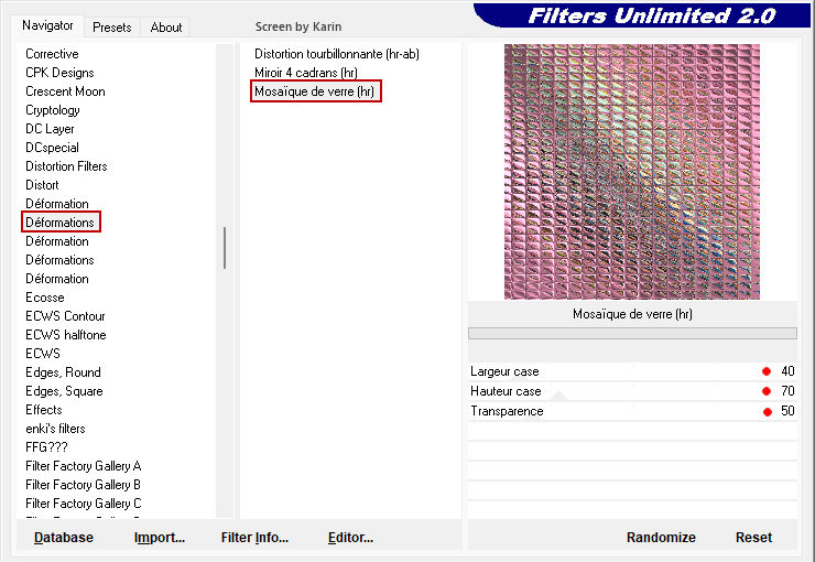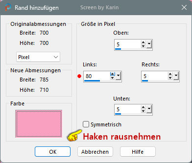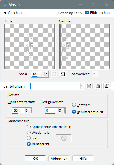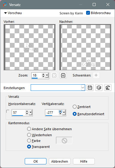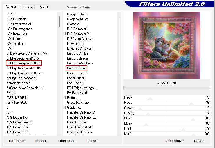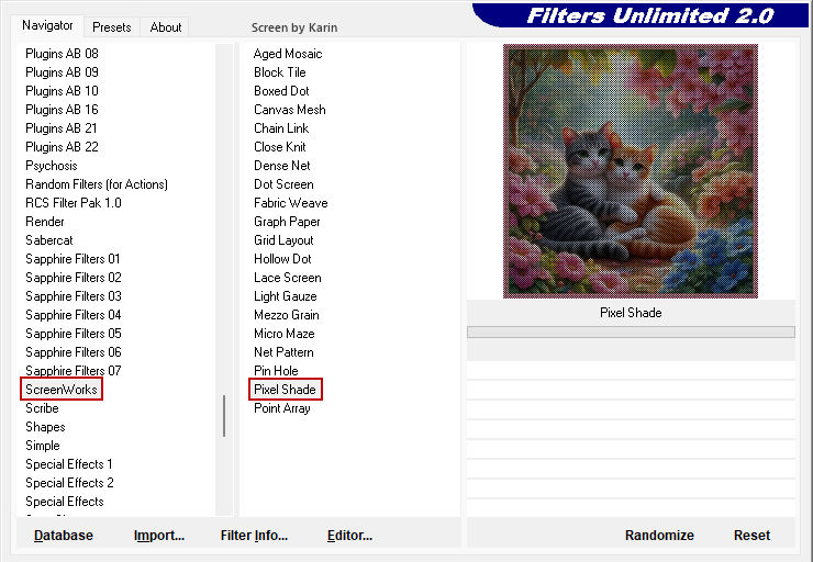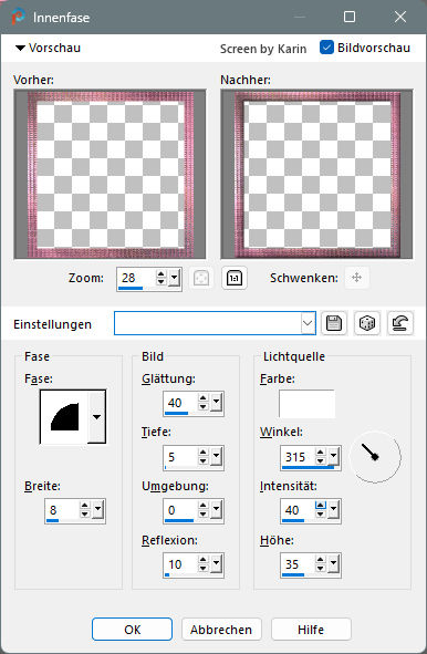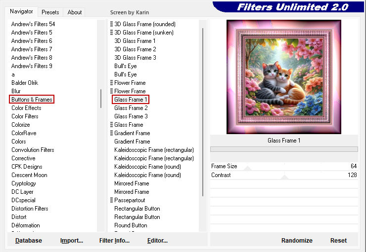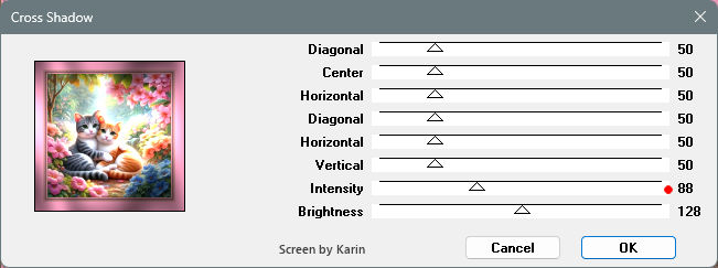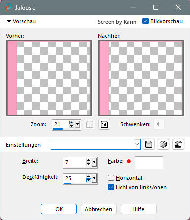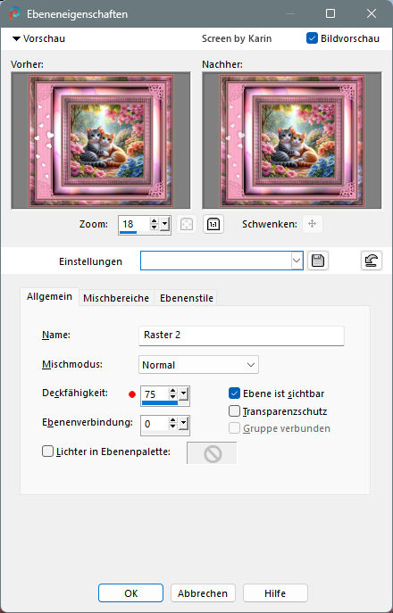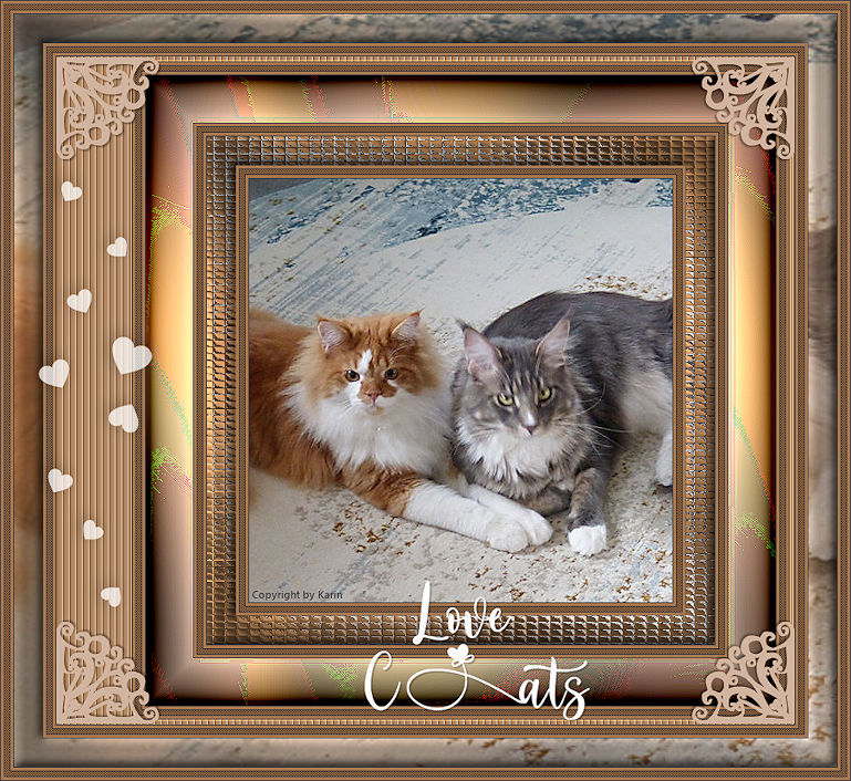 ![]() Rahmentutorial "Love Cats" Übersetzung mit PSP 2020, im Februar 2025 ![]() Benötigt wird das Material von Ria, das mit Klick auf den roten Ordner heruntergeladen werden kann. Das Copyright der genutzten Materialien, liegt beim jeweiligen Künstler. Bitte respektiert das und gebt den Download-Inhalt nicht als euer Material aus. ![]() Inhalt: ![]() Externe Filter: Filters Unlimited / Deformation / Mosaique de verre (hr) Filters Unlimited / Screenworks / Pixel Shade Graphic Plus / Cross Shadow Filters Unlimited / &<Bkg Designer sf10II> / Emboss Times Filters Unlimited / Buttons & Frames / Glass Frame 1 Simple / Top Left Mirror Wer den Filter Deformation / Mosaique de verre (hr) als ffx. Datei braucht, bitte den Ordner anklicken und den Filter in euer FU-Verzeichnis extrahieren. ![]() Inhalt: Vorbereitung: Die Originalfarben vom Tutorial sind: ![]() Kopiere die Farbkästchen (Rechtsklick - Bild kopieren) und füge sie auf deinem Arbeitsplatz im PSP ein, dann kannst du einfach mit der Pipette die jeweilige Farbe anklicken. Wähle eine dunklere und eine hellere Farbe aus deinem Bild, oder eben die Originalfarben. In der Materialpalette Dunkel als Vordergrundfarbe, Hell als Hintergrundfarbe einstellen. Öffne das heruntergeladene Material in deinem PSP, dupliziere es, wir arbeiten mit den Duplikaten. Oder benutze eigenes Material in der passenden Größe, dann bitte die Farben an dein Material anpassen. Alle Angaben zum Versatz, oder Filtereinstellungen, beziehen sich auf die Materialien und Bildgrößen vom Original-Tutorial. Wenn eigene Materialen verwendet werden, ist es vielleicht hilfreich, oder notwendig, sich an dem Vorschaubild zu orientieren. Fertige noch eine Kopie von deinem Hauptbild an Bearbeiten / Kopieren Bearbeiten / Als neues Bild einfügen Minimiere die Kopie an den unteren Bildrand ********************************************************************* Das Lineal kann als Orientierungshilfe mit der linken Maustaste mitgezogen werden. Schritt 1 Öffne das Bild "love cats.jpg" (aus dem Downloadmaterial) Bild / Rand hinzufügen 1 px Vordergrundfarbe 3 px Hintergrundfarbe 1 px Vordergrundfarbe 5 px Hintergrundfarbe Diesen Rand mit dem Zauberstab markieren Effekte / Plugins / Filters Unlimited / Screenworks - Pixel Shade Einfach auf "Apply" klicken, es gibt keine einstellbaren Werte Siehe Screenshot ![]() Auswahl / Auswahl aufheben Bild / Rand hinzufügen 1 px Vordergrundfarbe 3 px Hintergrundfarbe 1 px Vordergrundfarbe Schritt 2 Bild / Rand hinzufügen 30 px Hintergrundfarbe Diesen Rand mit dem Zauberstab markieren Effekte / Plugins / Graphic Plus / Cross Shadow Einstellungen siehe Screenshot ![]() Effekte / Plugins / Filters Unlimited / Deformation - Mosaique de verre (hr) Einstellungen siehe Screenshot ![]() Effekte / 3D-Effekte - Innenfase (Fase 2) Einstellungen siehe Screenshot ![]() Auswahl / Auswahl aufheben Schritt 3 Bild / Rand hinzufügen 1 px Vordergrundfarbe 3 px Hintergrundfarbe 1 px Vordergrundfarbe 5 px Hintergrundfarbe Diesen Rand mit dem Zauberstab markieren Effekte / Plugins / Filters Unlimited / Screenworks - Pixel Shade Einfach auf "Apply" klicken, es gibt keine einstellbaren Werte (Siehe Screenshot Schritt 1) Auswahl / Auswahl aufheben Bild / Rand hinzufügen 1 px Vordergrundfarbe 3 px Hintergrundfarbe 1 px Vordergrundfarbe Schritt 4 Bild / Rand hinzufügen 50 px Hintergrundfarbe Diesen Rand mit dem Zauberstab markieren Effekte / Graphic Plus / Cross Shadow (Einstellungen siehe Screenshot bei Schritt 2) Effekte / Filters Unlimited / &<Bkg Designer sf10II> - Emboss Times Mit den Standardeinstellungen Siehe Screenshot ![]() Effekte / Kanteneffekte - Nachzeichnen Einstellen / Schärfe - Scharfzeichnen Effekte / Plugins / Filters Unlimited / Buttons & Frames - Glass Frame 1 Mit den Standardeinstellungen Siehe Screenshot ![]() Auswahl / Auswahl aufheben Schritt 5 Bild / Rand hinzufügen 1 px Vordergrundfarbe 3 px Hintergrundfarbe 1 px Vordergrundfarbe 5 px Hintergrundfarbe Diesen Rand mit dem Zauberstab markieren Effekte / Plugins / Filters Unlimited / Screenworks - Pixel Shade Einfach auf "Apply" klicken, es gibt keine einstellbaren Werte (Siehe Screenshot Schritt 1) Auswahl / Auswahl aufheben Bild / Rand hinzufügen 1 px Vordergrundfarbe 3 px Hintergrundfarbe 1 px Vordergrundfarbe Schritt 6 Bild / Rand hinzufügen Mit der Hintergrundfarbe Nach folgenden Angaben Siehe Screenshot ![]() Diesen Rand mit dem Zauberstab markieren Effekte / Textureffekte - Jalousie Einstellungen siehe Screenshot ![]() Effekte / Kanteneffekte - Nachzeichnen Auswahl / Auswahl aufheben Schritt 7 Bild / Rand hinzufügen ( Bei Rand "Symmetrisch" wieder anhaken) 1 px Vordergrundfarbe 3 px Hintergrundfarbe 1 px Vordergrundfarbe 5 px Hintergrundfarbe Diesen Rand mit dem Zauberstab markieren Effekte / Plugins / Filters Unlimited / Screenworks - Pixel Shade Einfach auf "Apply" klicken, es gibt keine einstellbaren Werte (Siehe Screenshot Schritt 1) Auswahl / Auswahl aufheben Bild / Rand hinzufügen 1 px Vordergrundfarbe 3 px Hintergrundfarbe 1 px Vordergrundfarbe Schritt 8 Bild / Rand hinzufügen 30 px Hintergrundfarbe Diesen Rand mit dem Zauberstab markieren Effekte / Plugins / Graphic Plus / Cross Shadow Einstellungen siehe Screenshot bei Schritt 2 Aktiviere die Anfangs erstellte Kopie vom Hauptbild Bearbeiten / Kopieren Zurück zum Hauptbild Ebenen / Neue Rasterebene Bearbeiten / In eine Auswahl einfügen Ebenen / Eigenschaften Einstellung siehe Screenshot ![]() Ebenen / Zusammenführen - Alle zusammenfassen Effekte / 3D-Effekte - Innenfase Einstellungen siehe Screenshot bei Schritt 2 Auswahl / Auswahl aufheben Schritt 9 Bild / Rand hinzufügen ( Bei Rand "Symmetrisch" wieder anhaken) 1 px Vordergrundfarbe 3 px Hintergrundfarbe 1 px Vordergrundfarbe 5 px Hintergrundfarbe Diesen Rand mit dem Zauberstab markieren Effekte / Plugins / Filters Unlimited / Screenworks - Pixel Shade Einfach auf "Apply" klicken, es gibt keine einstellbaren Werte (Siehe Screenshot Schritt 1) Auswahl / Auswahl aufh