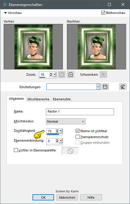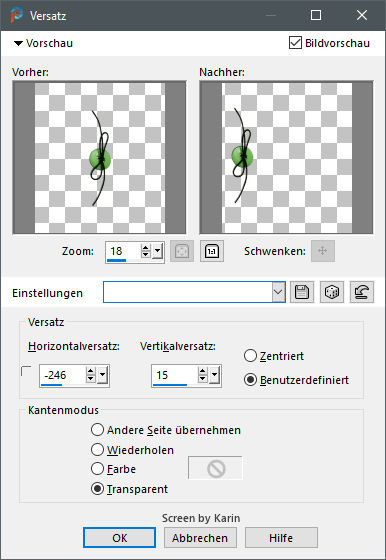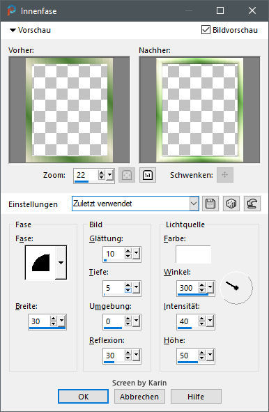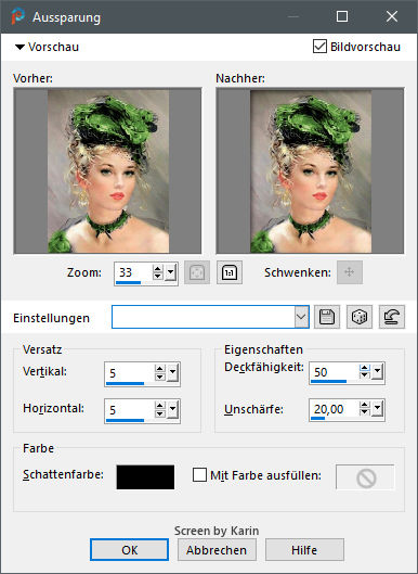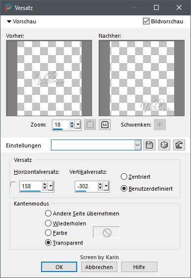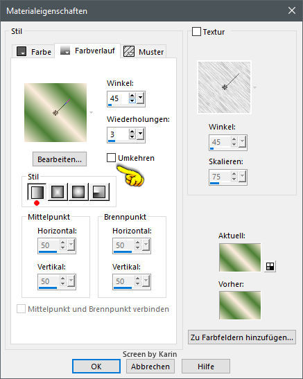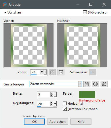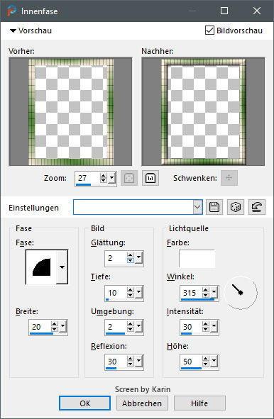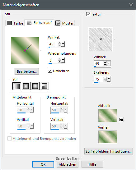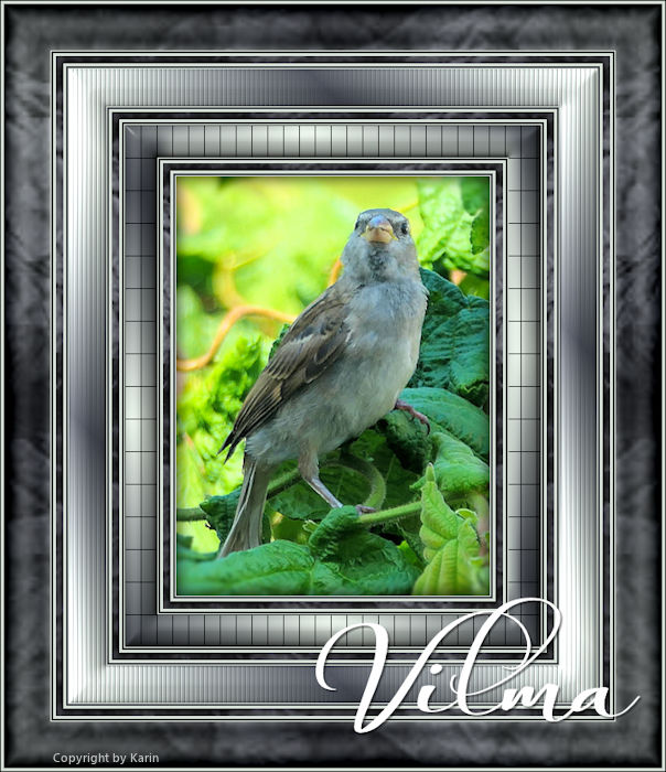 ![]() Rahmentutorial "Vilma" Übersetzung mit PSP 2020, im Juli 2024 ![]() Benötigt wird das Material von Ria, das mit Klick auf den roten Ordner heruntergeladen werden kann. Das Copyright der genutzten Materialien, liegt beim jeweiligen Künstler. Bitte respektiert das und gebt den Download-Inhalt nicht als euer Material aus. ![]() Inhalt: ![]() Externe Filter: Filter Unlimited / Buttons & Frames / Glass Frame 2 Filter Unlimited / Filter Factory Gallery V / Ommadawn Xero / Clarity Vorbereitung: Die Originalfarben vom Tutorial sind: ![]() Kopiere die Farbkästchen (Rechtsklick - Bild kopieren) und füge sie auf deinem Arbeitsplatz im PSP ein, dann kannst du einfach mit der Pipette die jeweilige Farbe anklicken. Wähle eine hellere und eine dunklere Farbe aus deinem Bild, oder eben die Originalfarben. In der Materialpalette Hell als Vordergrundfarbe, Dunkel als Hintergrundfarbe einstellen. Erstelle damit (z.B. bei "Vordergrund") folgenden Farbverlauf: Einstellungen siehe Screenshot ![]() Öffne das heruntergeladene Material in deinem PSP, dupliziere es, wir arbeiten mit den Duplikaten. Oder benutze eigenes Material in der passenden Größe, dann bitte die Farben an dein Material anpassen. ********************************************************************* Das Lineal kann als Orientierungshilfe mit der linken Maustaste mitgezogen werden. ![]() Schritt 1 Öffne das Bild "vilma.jpg" (aus dem Downloadmaterial) Auswahl / Alle auswählen Effekte / 3D-Effekte - Aussparung Einstellungen siehe Screenshot ![]() Wiederhole Effekte / 3D-Effekte - Aussparung Jetzt bei Vertikal und Horizontal ein Minuszeichen vor die 5 setzen Auswahl / Auswahl aufheben Schritt 2 Bild / Rand hinzufügen 1 px Vordergrundfarbe 2 px Hintergrundfarbe 3 px Vordergrundfarbe Auswahl / Alle auswählen Bild / Rand hinzufügen 8 px Hintergrundfarbe Auswahl / Umkehren Öffne das Bild "Textuur.jpg" Bearbeiten / Kopieren Zurück zum Hauptbild Bearbeiten / In eine Auswahl einfügen Effekte / Plugins / Xero - Clarity Mit den Standardeinstellungen Siehe Screenshot ![]() Auswahl / Auswahl aufheben Bild / Rand hinzufügen 3 px Vordergrundfarbe 2 px Hintergrundfarbe 1 px Vordergrundfarbe Schritt 3 Auswahl / Alle auswählen Bild / Rand hinzufügen 35 px Vordergrundfarbe Auswahl / Umkehren Diese Auswahl mit dem Farbverlauf (siehe Vorbereitung) befüllen Effekte / Plugins / Filter Unlimited / Filter Factory Gallery V - Ommadawn Einstellungen siehe Screenshot ![]() Effekte / 3D-Effekte - Innenfase (Fase 2) Einstellungen siehe Screenshot ![]() Auswahl / Auswahl aufheben Schritt 4 Bild / Rand hinzufügen 1 px Vordergrundfarbe 2 px Hintergrundfarbe 3 px Vordergrundfarbe Auswahl / Alle auswählen Bild / Rand hinzufügen 8 px Hintergrundfarbe Auswahl / Umkehren Öffne das Bild "Textuur.jpg" Bearbeiten / Kopieren Zurück zum Hauptbild Bearbeiten / In eine Auswahl einfügen Effekte / Plugins / Xero - Clarity Mit den Standardeinstellungen Wie oben bei Schritt 2 Auswahl / Auswahl aufheben Bild / Rand hinzufügen 3 px Vordergrundfarbe 2 px Hintergrundfarbe 1 px Vordergrundfarbe Schritt 5 Auswahl / Alle auswählen Bild / Rand hinzufügen 40 px Vordergrundfarbe Auswahl / Umkehren Stelle den Farbverlauf um Siehe Screenshot ![]() Und befülle diese Auswahl damit Effekte / Textureffekte - Jalousie Einstellungen siehe Screenshot ![]() Effekte / Kanteneffekte - Nachzeichnen Effekte / 3D-Effekte - Innenfase (Fase 2) Einstellungen siehe Screenshot ![]() Auswahl / Auswahl aufheben Schritt 6 Bild / Rand hinzufügen 1 px Vordergrundfarbe 2 px Hintergrundfarbe 3 px Vordergrundfarbe Auswahl / Alle auswählen Bild / Rand hinzufügen 8 px Hintergrundfarbe Auswahl / Umkehren Öffne das Bild "Textuur.jpg" Bearbeiten / Kopieren Zurück zum Hauptbild Bearbeiten / In eine Auswahl einfügen Effekte / Plugins / Xero - Clarity Mit den Standardeinstellungen Wie oben bei Schritt 2 Auswahl / Auswahl aufheben Bild / Rand hinzufügen 3 px Vordergrundfarbe 2 px Hintergrundfarbe 1 px Vordergrundfarbe Schritt 7 Auswahl / Alle auswählen Bild / Rand hinzufügen 50 px Vordergrundfarbe Auswahl / Umkehren Diesen Rand mit dem Verlauf befüllen Ebenen / Neue Rasterebene Öffne das Bild "Textuur.jpg" Bearbeiten / Kopieren Zurück zum Hauptbild Bearbeiten / In eine Auswahl einfügen Ebenen / Eigenschaften Einstellungen siehe Screenshot ![]() Effekte / Plugins / Xero - Clarity Mit den Standardeinstellungen Wie oben bei Schritt 2 Ebenen / Zusammenführen - Alle zusammenfassen Effekte / Plugins / Filter Unlimited / Buttons & Frames - Glass Frame 2 Mit den Standardeinstellungen Siehe Screenshot ![]() Auswahl / Auswahl aufheben Bild / Rand hinzufügen 3 px Vordergrundfarbe 1 px Extrafarbe (#000000) Schritt 8 Öffne die Tube "deco-vilma.png" Bearbeiten / Kopieren Zurück zum Hauptbild Bearbeiten / Als neue Ebene einfügen Effekte / Bildeffekte - Versatz Einstellungen siehe Screenshot ![]() Öffne die Tube "tekst-vilma-Ri@.png" Bearbeiten / Kopieren Zurück zum Hauptbild Bearbeiten / Als neue Ebene einfügen Effekte / Bildeffekte - Versatz Einstellungen siehe Screenshot ![]() Setze noch dein Wasserzeichen, oder Copy auf das Bild Ebenen / Zusammenführen - Alle zusammenfassen Bild / Größe ändern längste Seite z.B. auf 700 Pixel Oder nach deinem Belieben Schärfe dein Bild eventuell nach Einstellen / Schärfe / Scharfzeichnen Nun ist die Arbeit geschafft, ich hoffe es hat ein bisschen Spaß gemacht. Danke an Ria ![]() Weitere Beispiele: ![]() Dankeschön liebe Doris ![]() ![]() ![]() |